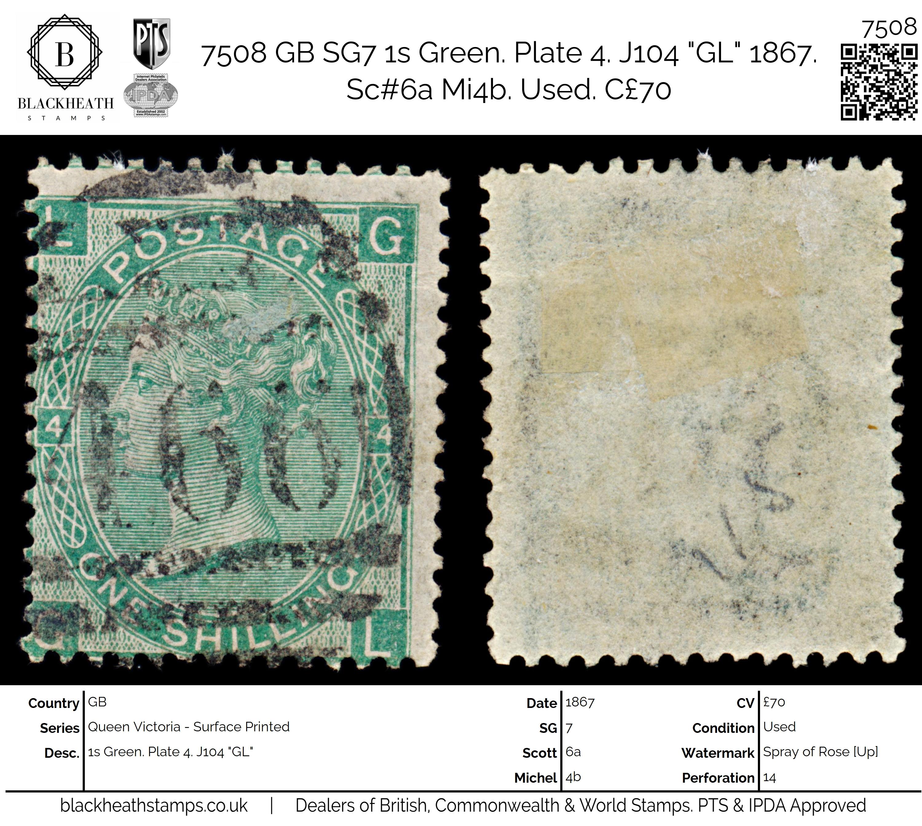 7508 GB SG117 1s Green. Plate 4. J104 "GL" 1867. Sc#54 Mi33. Uséd. C£70: