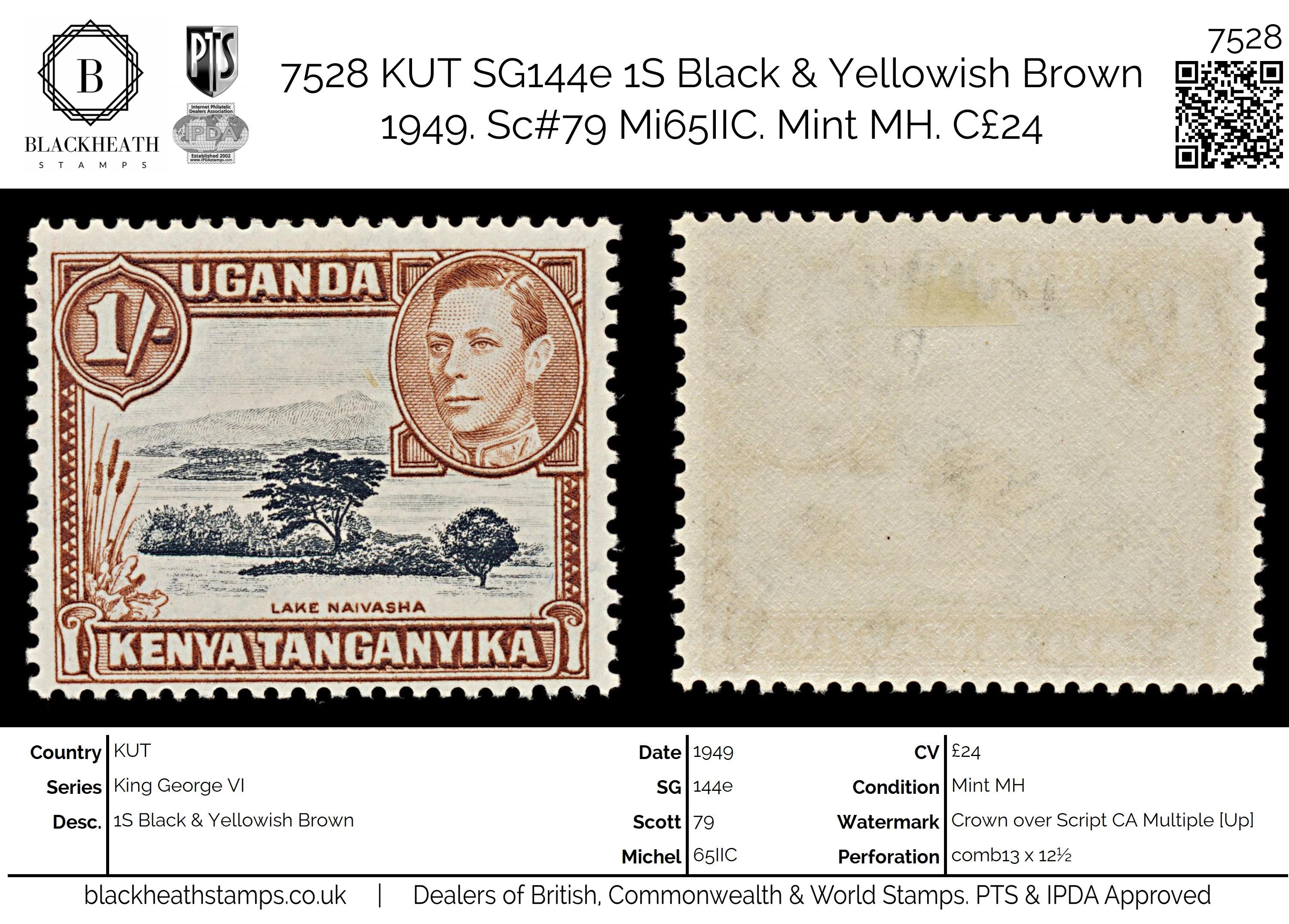 7528 KUT SG145b 1S Black & Yellowish Brown 1949. Sc#80a Mi66C. Mint MH. C£24: