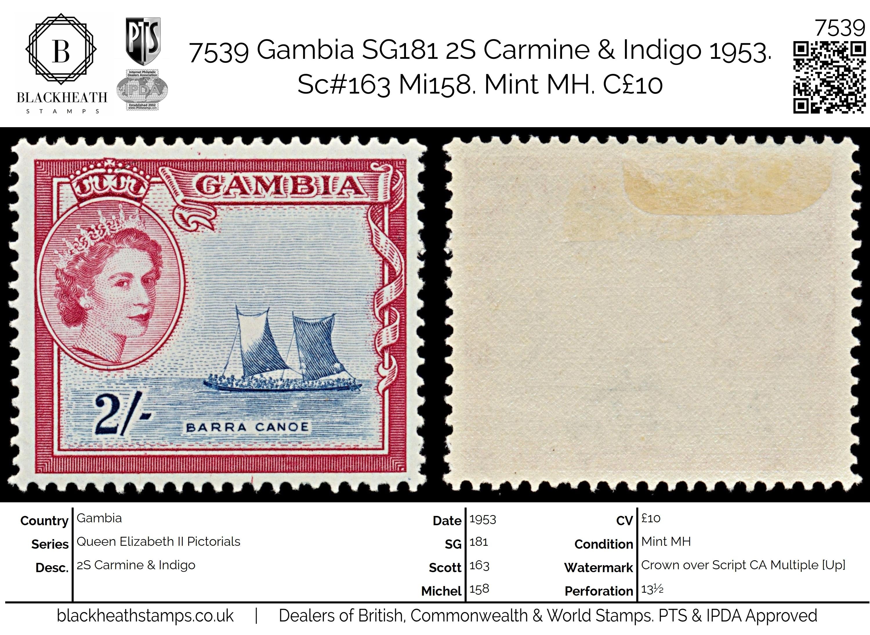 7539 Gambia SG180 2S Carmine & Indigo 1953. Sc#162 Mi157. Mint MH. C£10