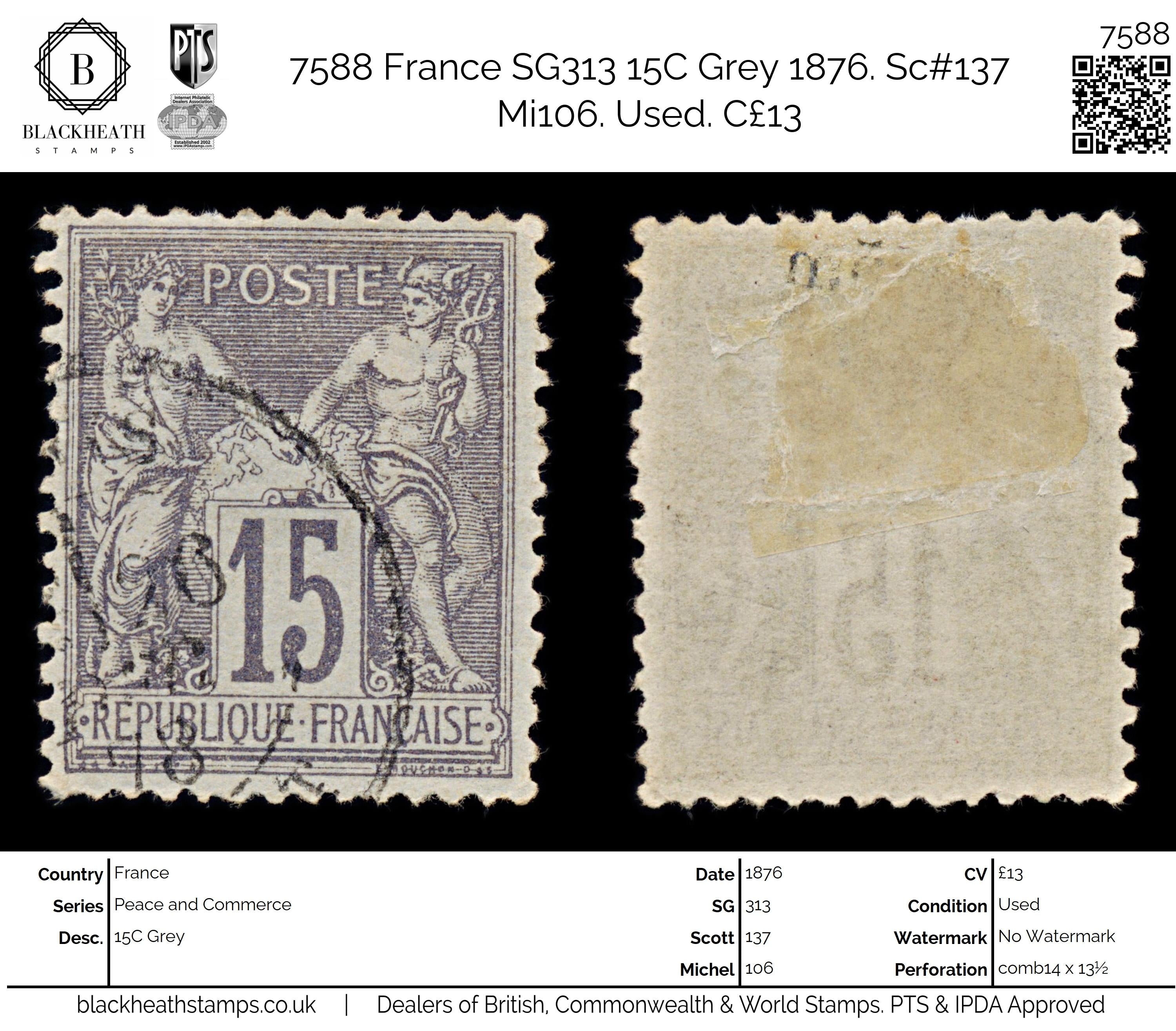 7588 France SG217 15C Grey 1876. Sc#69 Mi61I. Uséd. C£13: