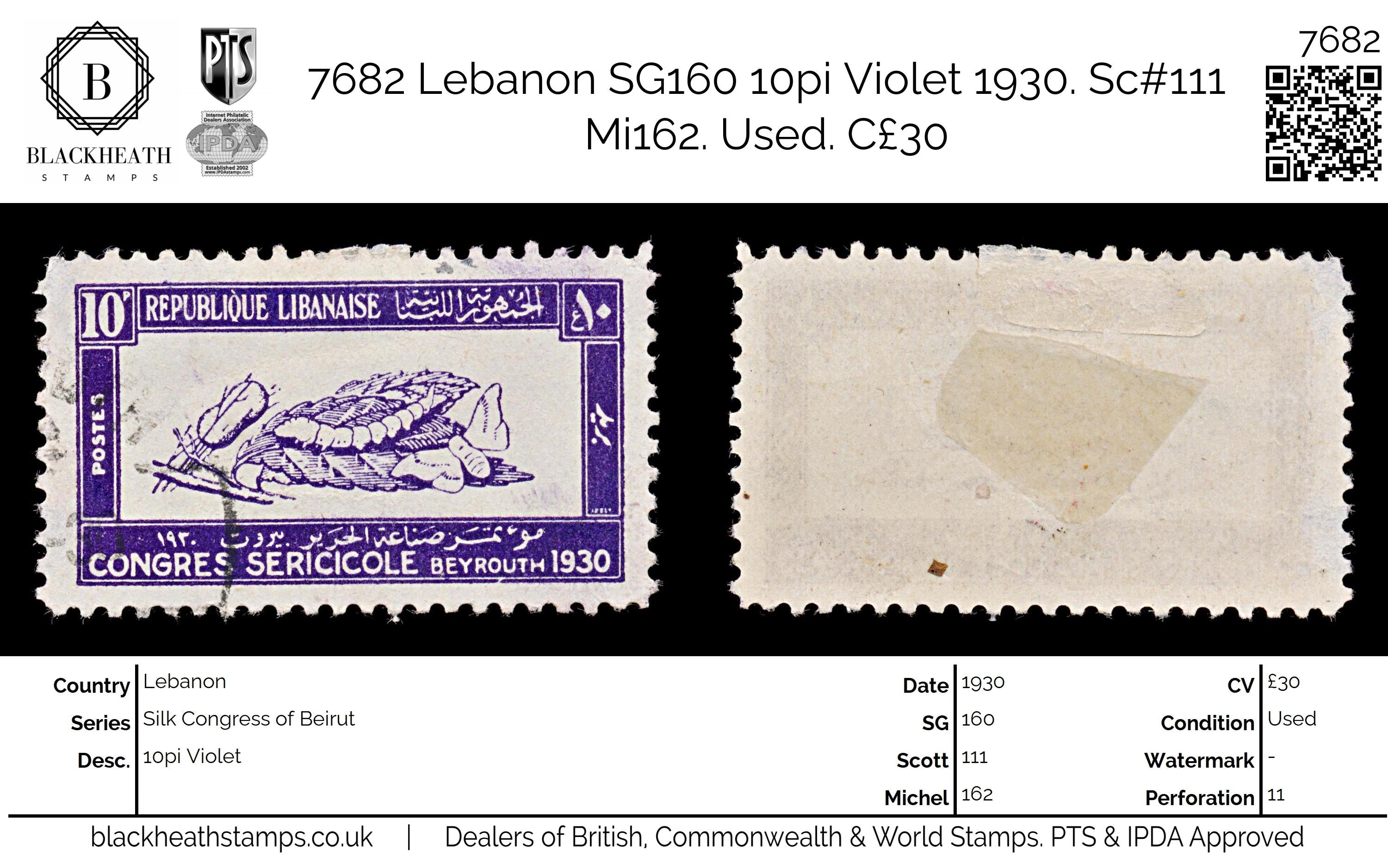 7682 Lebanon SG160 10pi Violet 1930. Sc#111 Mi162. Uséd. C£30: