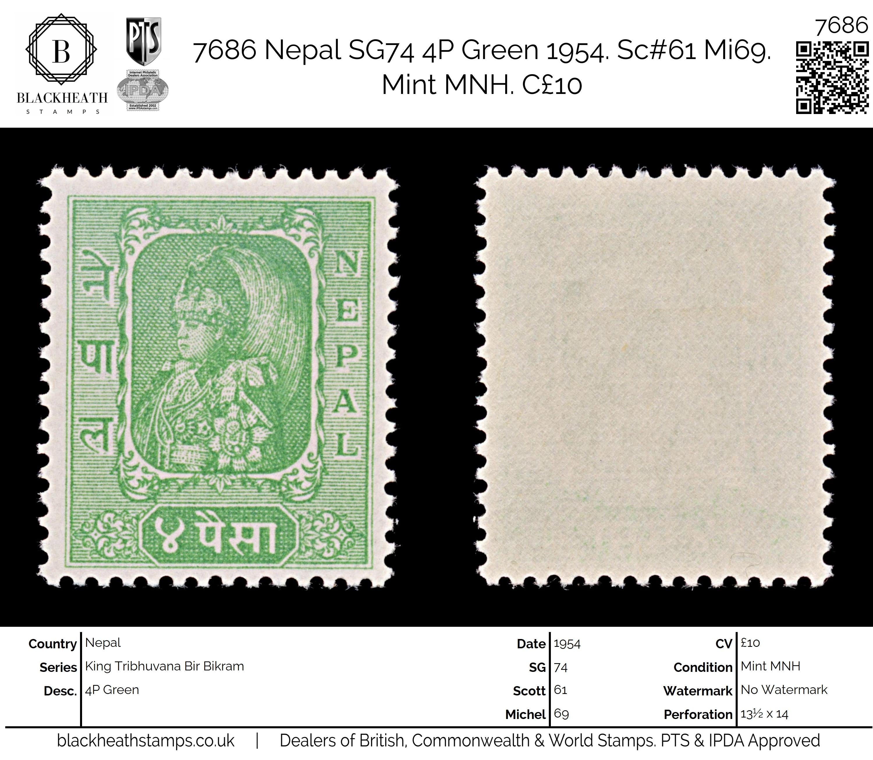 7686 Nepal SG74 4P Green 1954. Sc#61 Mi69. Mint MNH. C£10: