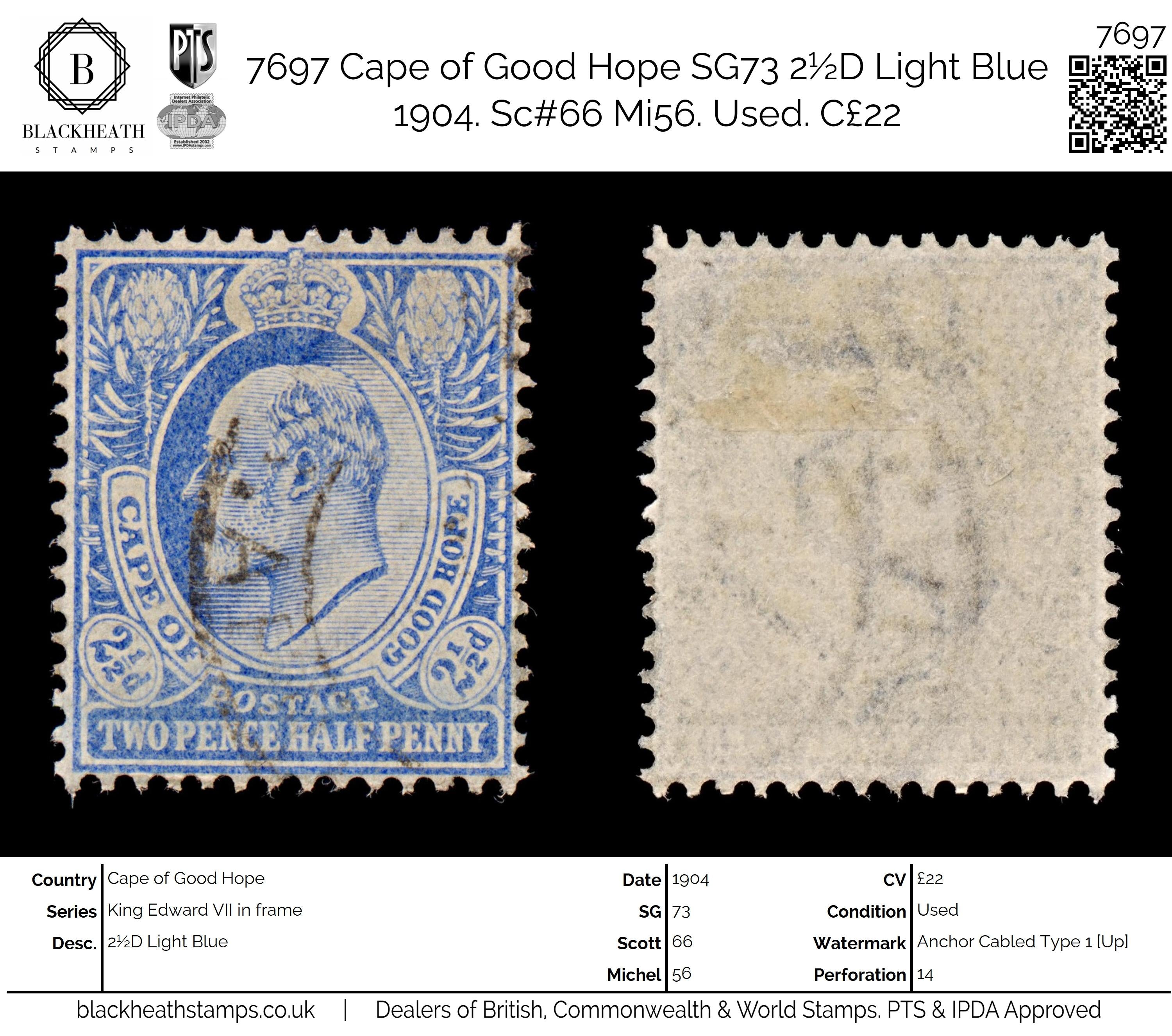 7697 Cape of Good Hope SG73 2½D Light Blue 1904. Sc#66 Mi56. Uséd. C£22: