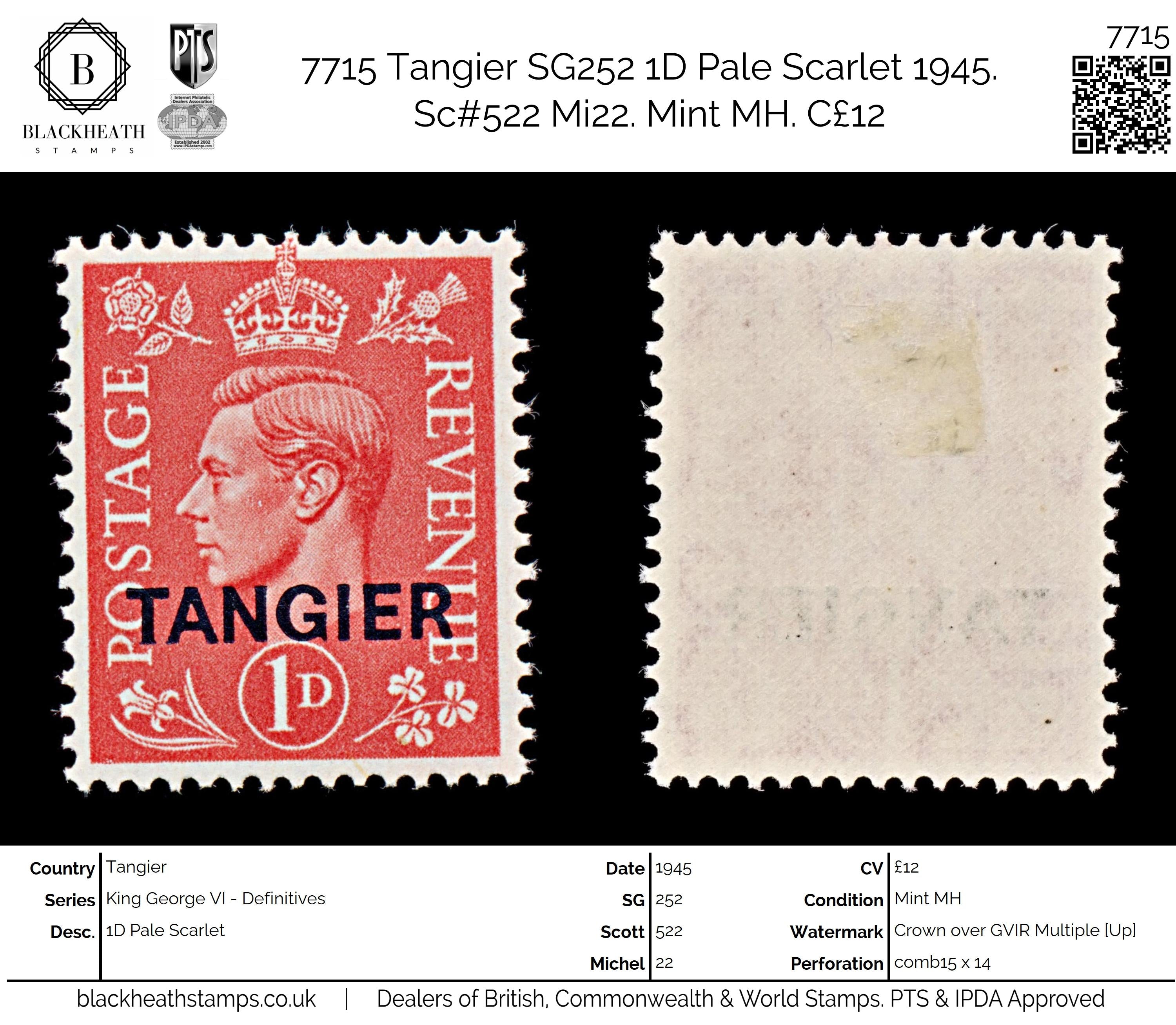 7715 Tangier SG252 1D Pale Scarlet 1945. Sc#522 Mi22. Mint MH. C£12