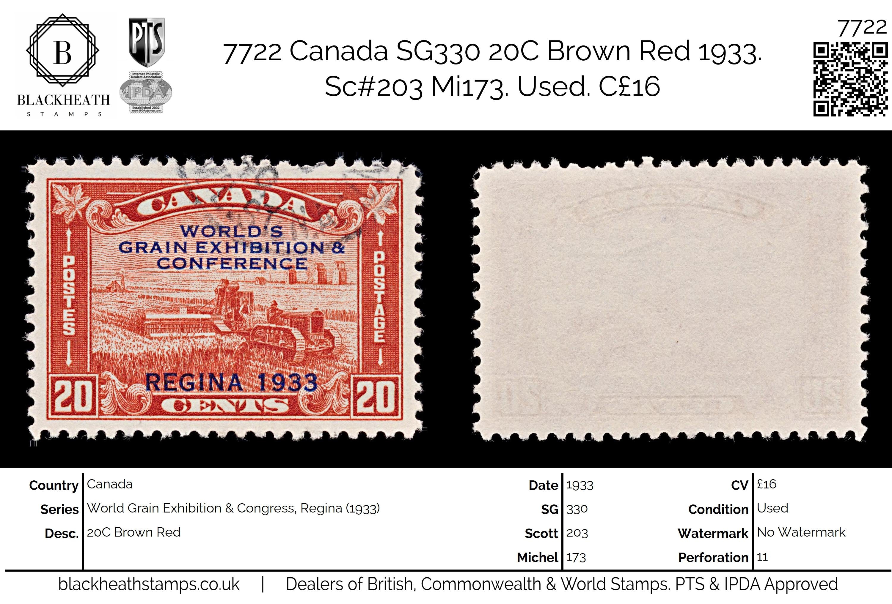 7722 Canada SG330 20C Brown Red 1933. Sc#203 Mi173. Used. C£16