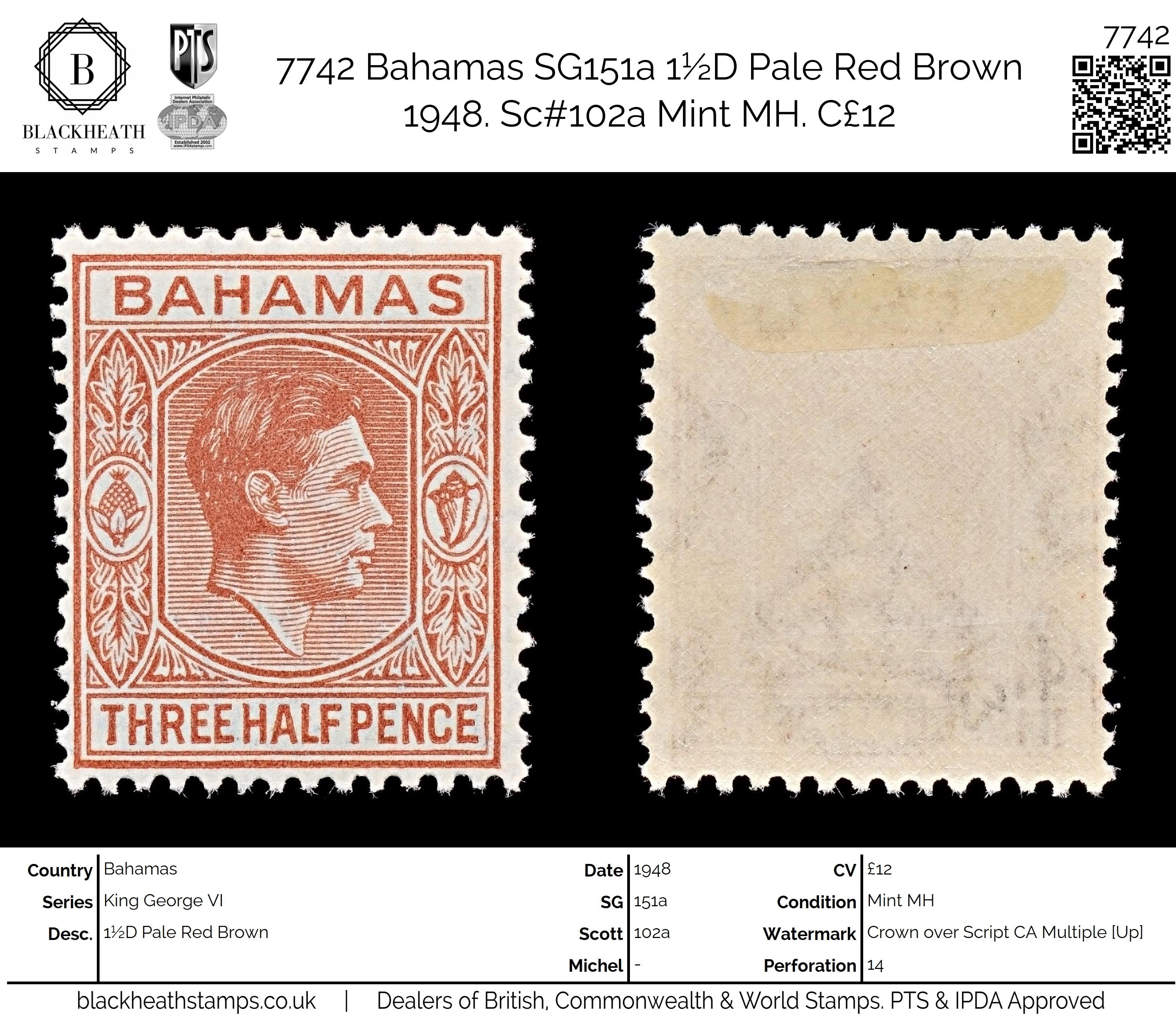 7742 Bahamas SG151a 1½D Pale Red Brown 1948. Sc#102a Mint MH. C£12: