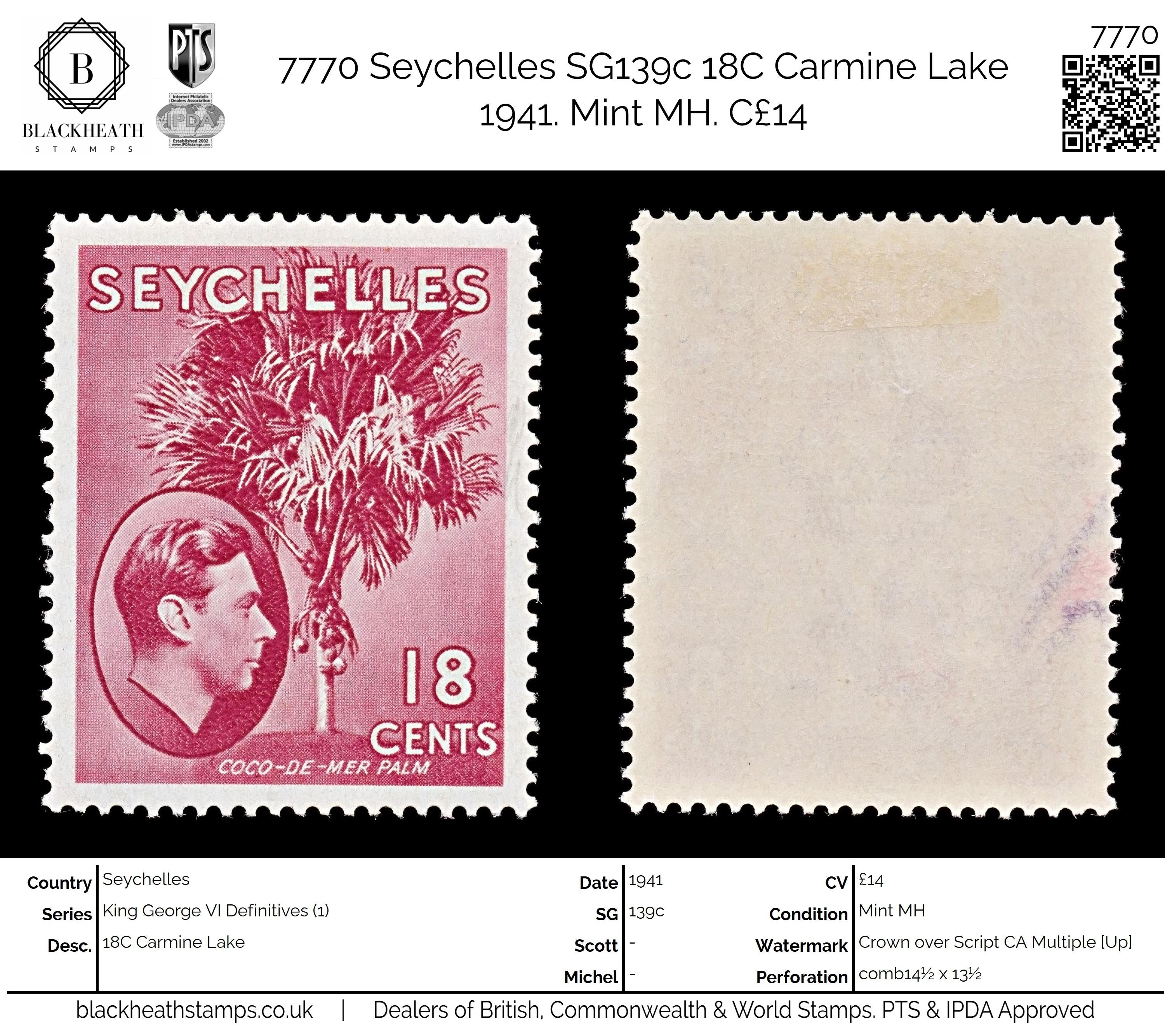 7770 Seychelles SG139c 18C Carmine Lake 1941. Mint MH. C£14: