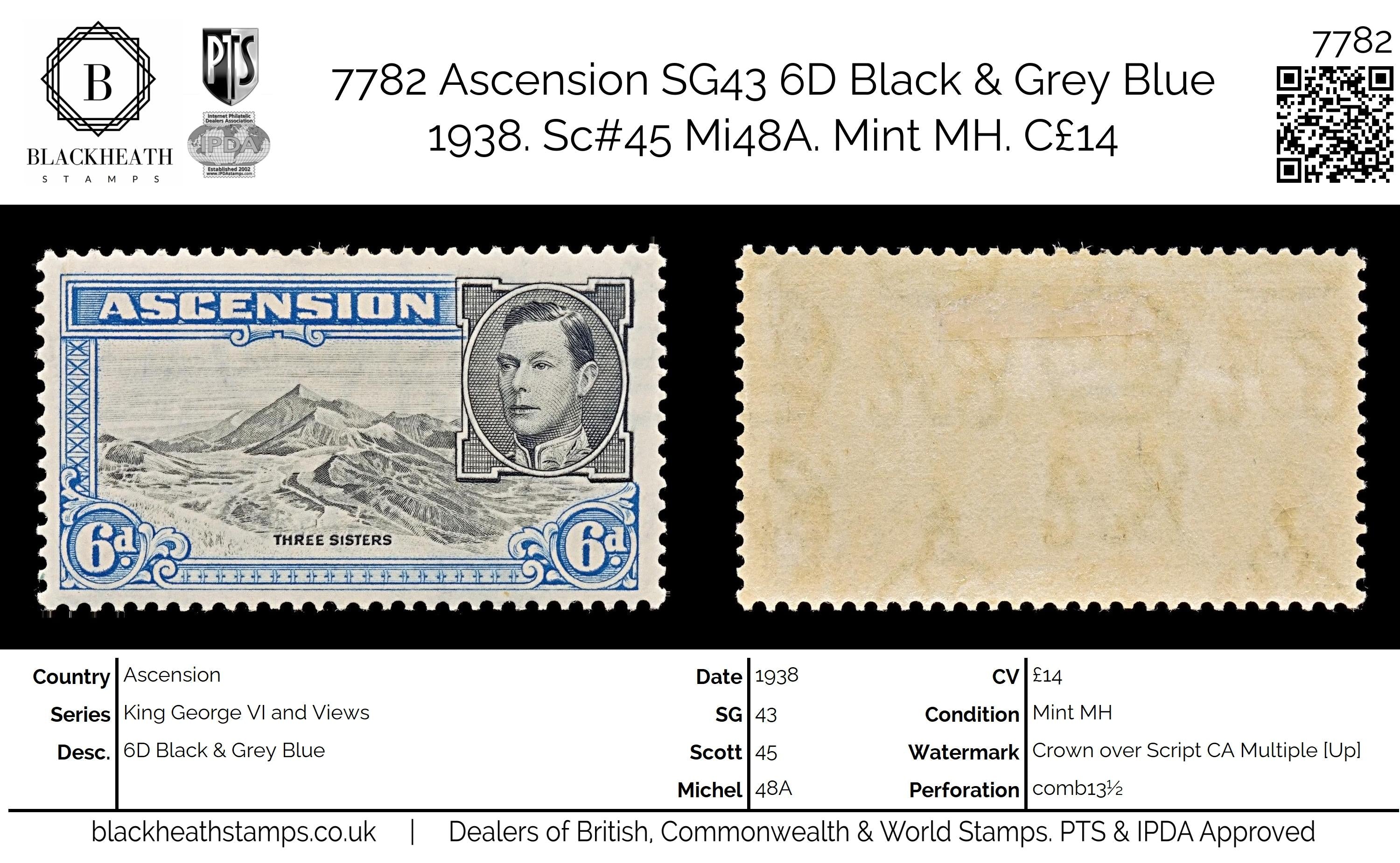7782 Ascension SG43 6D Black & Grey Blue 1938. Sc#45 Mi48A. Mint MH. C£14