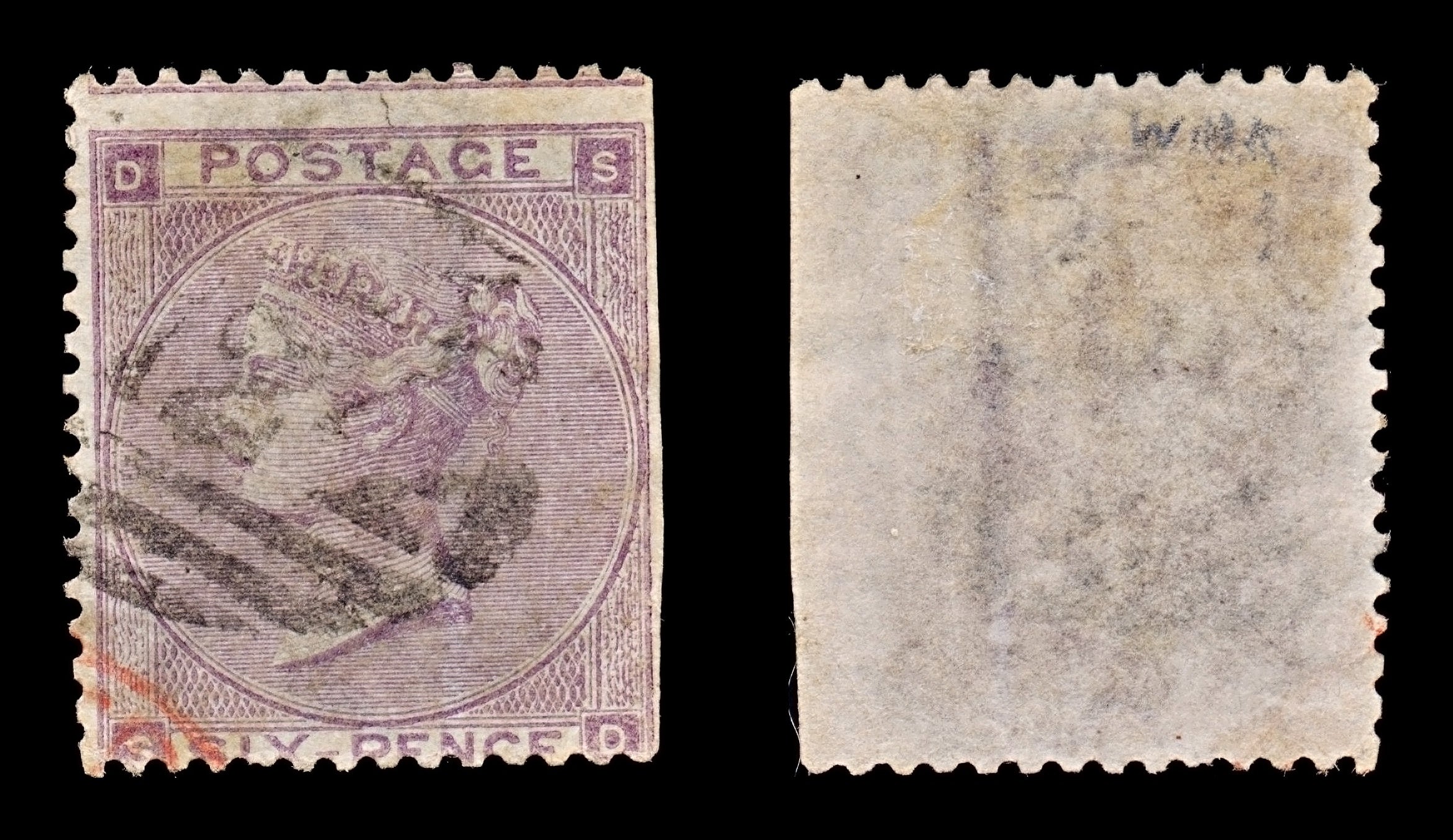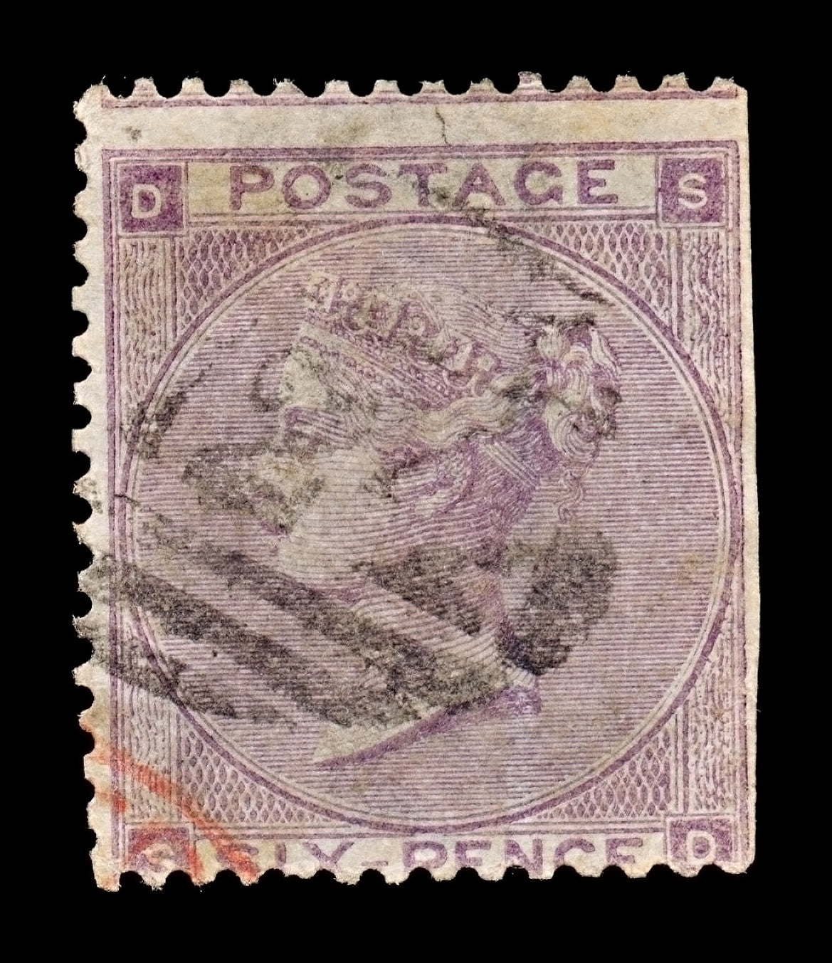 7820 GB SG84 6D Lilac. Watermark Error 1862. Sc#39 Mi20Ib. Uséd: Wmk Error/ big Watermark shift. Interestingly this postional SD meaning that the A-C verticially and T horizontally would have had no watermark