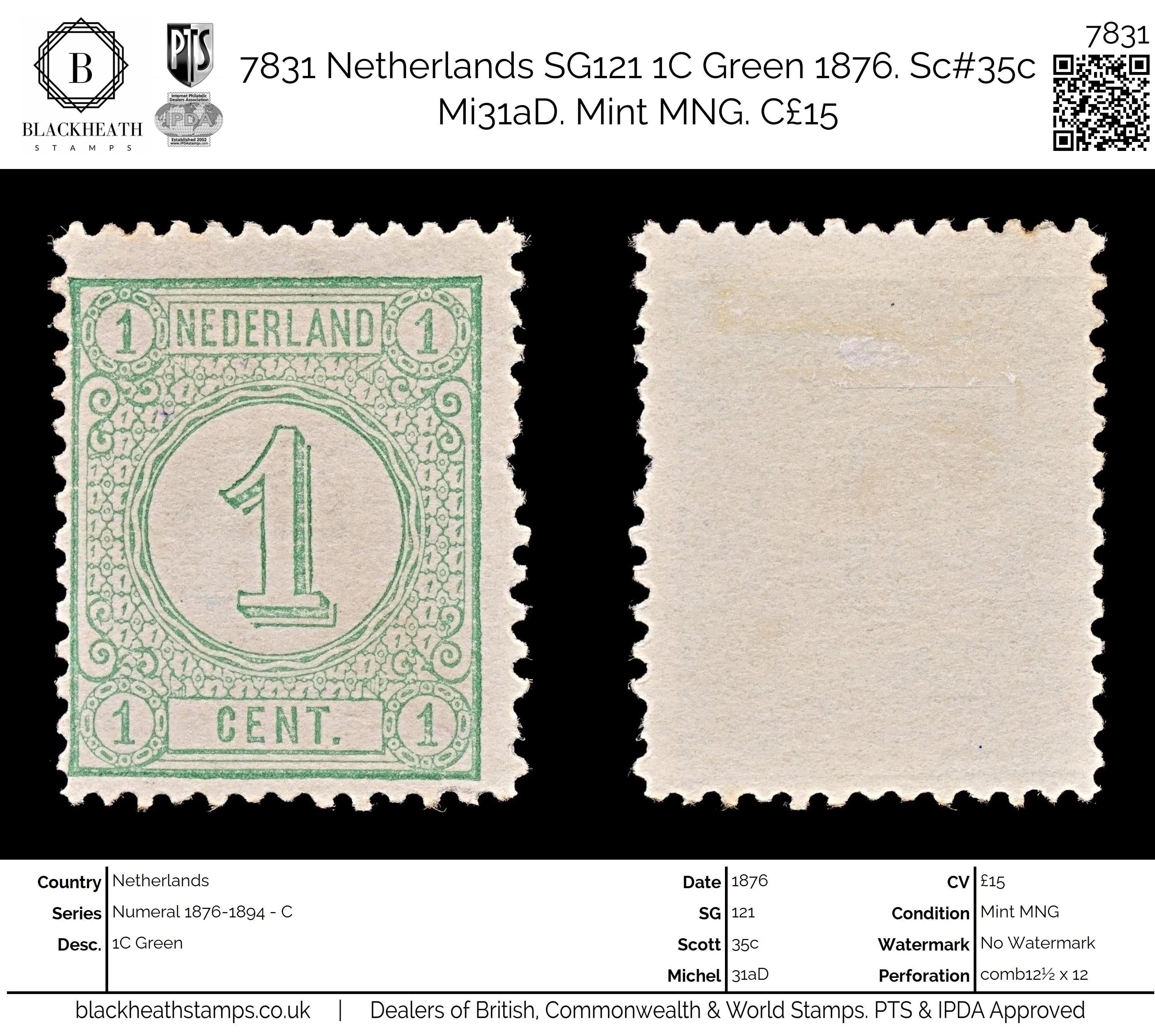 7831 Netherlands SG121 1C Green 1876. Sc#35c Mi31aD. Mint MNG. C£15: