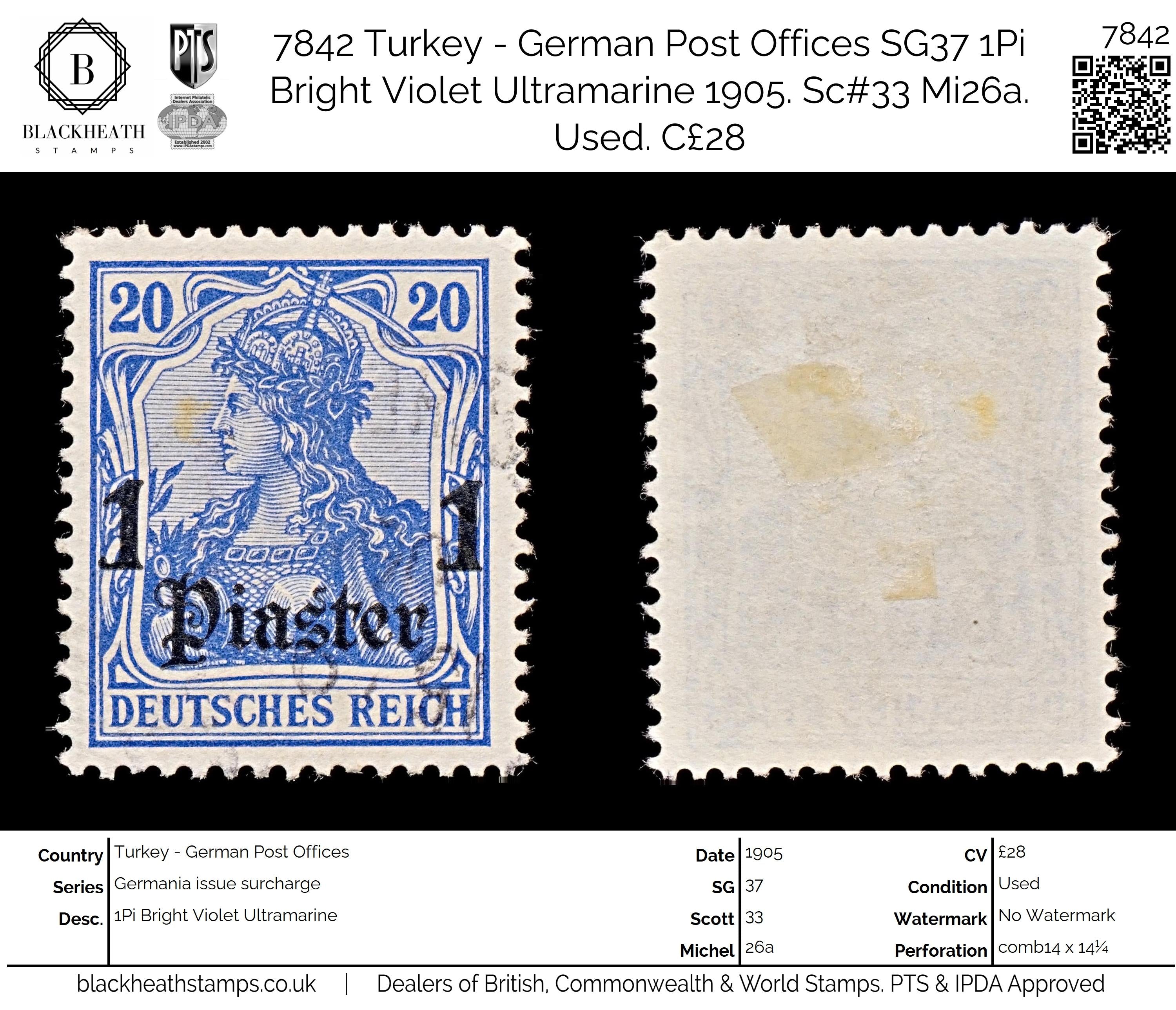 7842 Turkey - German Post Offices SG37 1Pi Bright Violet Ultramarine 1905. Sc#33 Mi26a. Uséd. C£28: