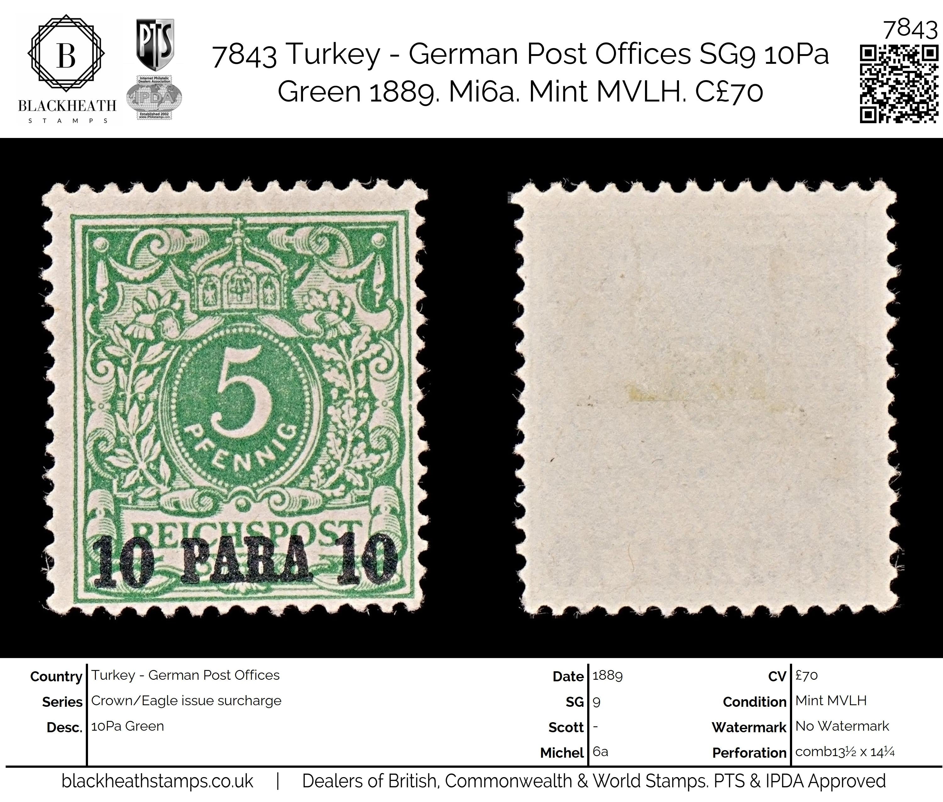 7843 Turkey - German Post Offices SG9 10Pa Green 1889. Mi6a. Mint MVLH. C£70