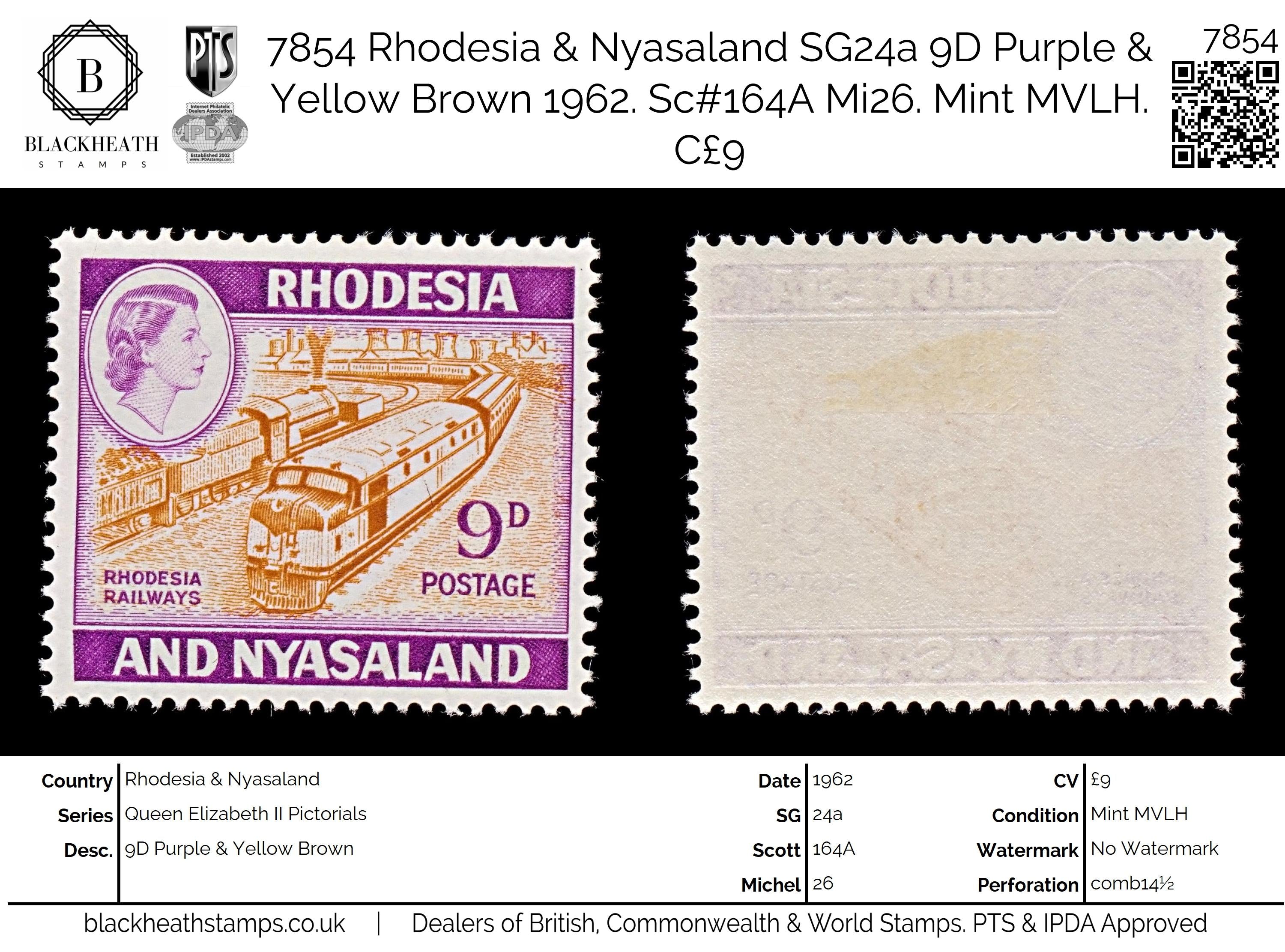 7854 Rhodesia & Nyasaland SG24a 9D Purple & Yellow Brown 1962. Sc#164A Mi26. Mint MVLH. C£9: