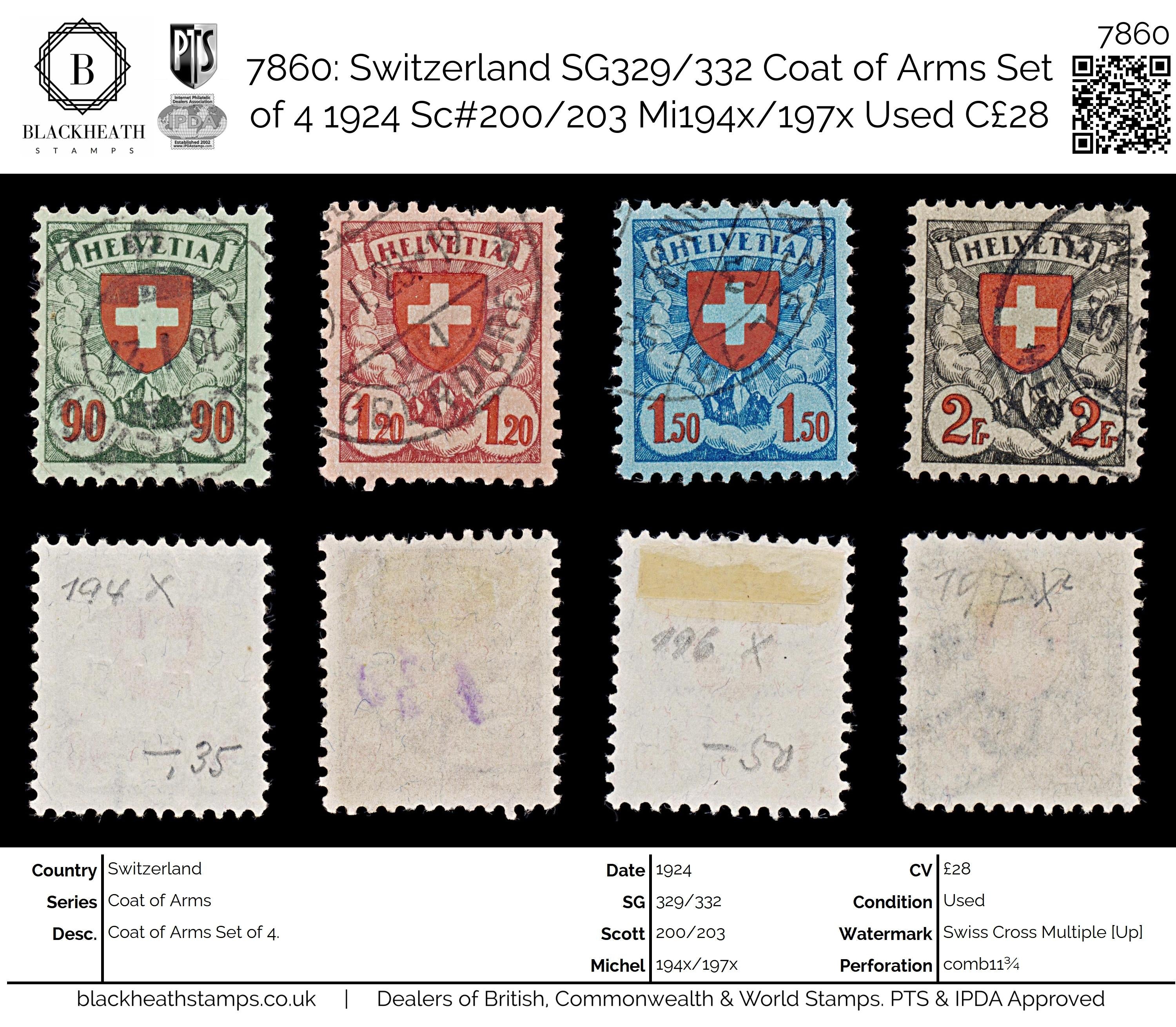 7860: Switzerland SG329/332 Coat of Arms Set of 4 1924 Sc#200/203 Mi194x/197x Uséd C£28