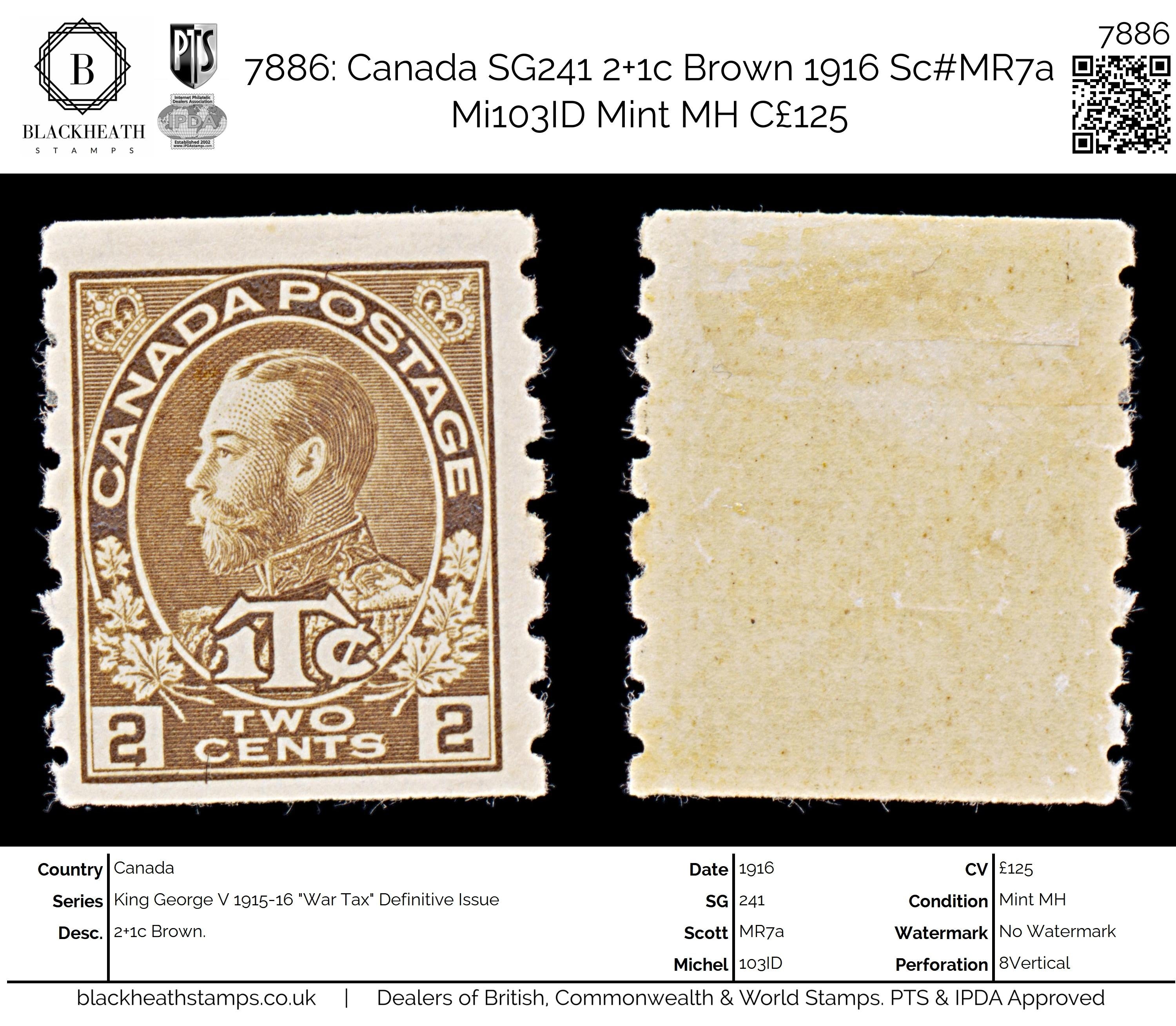 7886: Canada SG241 2+1c Brown 1916 Sc#MR7a Mi103ID Mint MH C£125