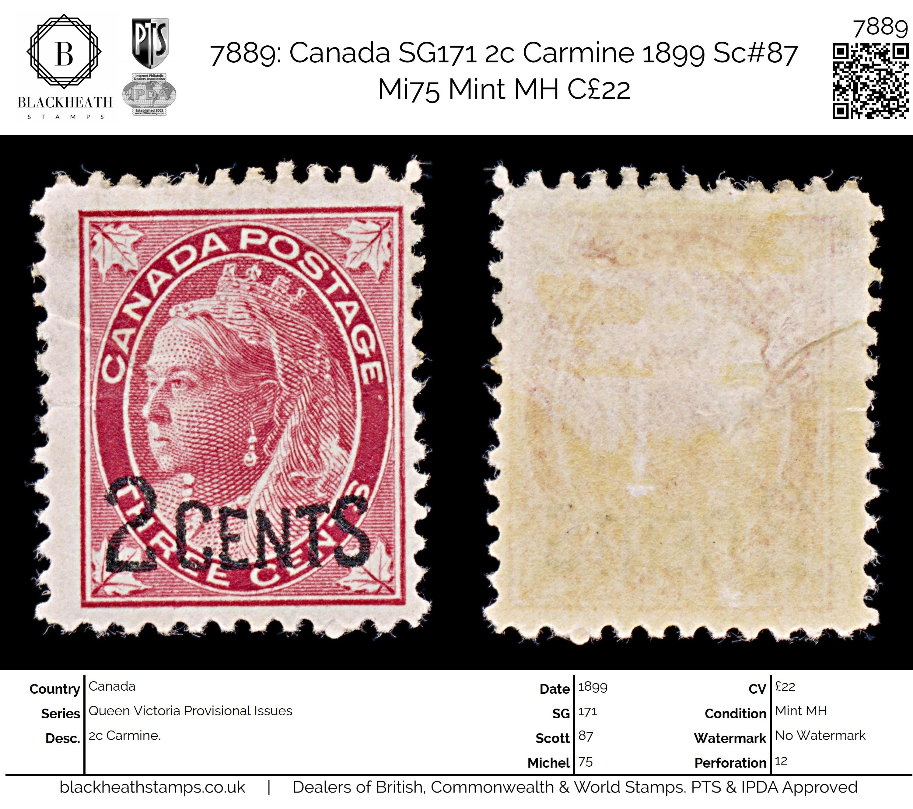 7889: Canada SG171 2c Carmine 1899 Sc#87 Mi75 Mint MH C£22