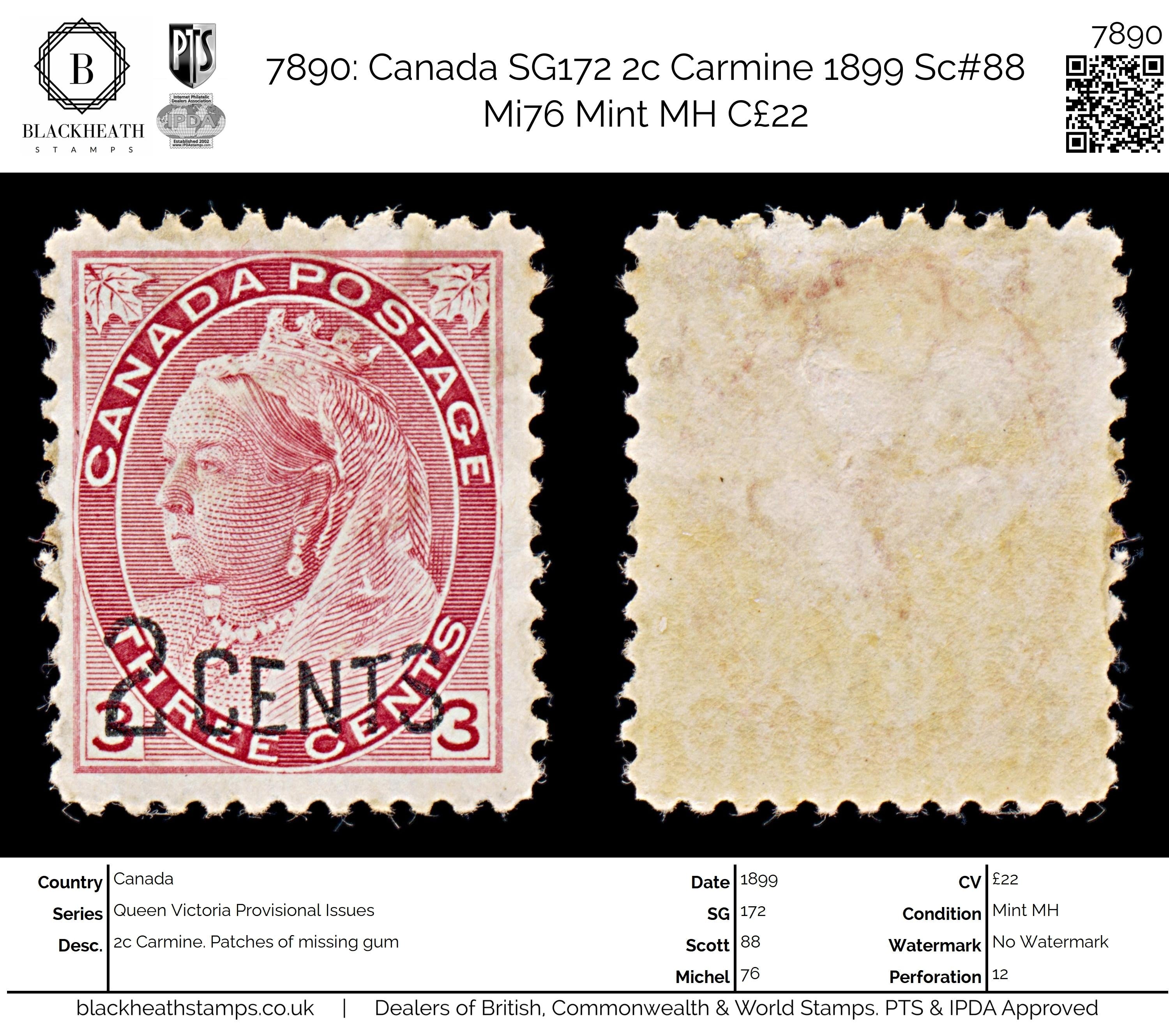 7890: Canada SG172 2c Carmine 1899 Sc#88 Mi76 Mint MH C£22: Patches of missing gum