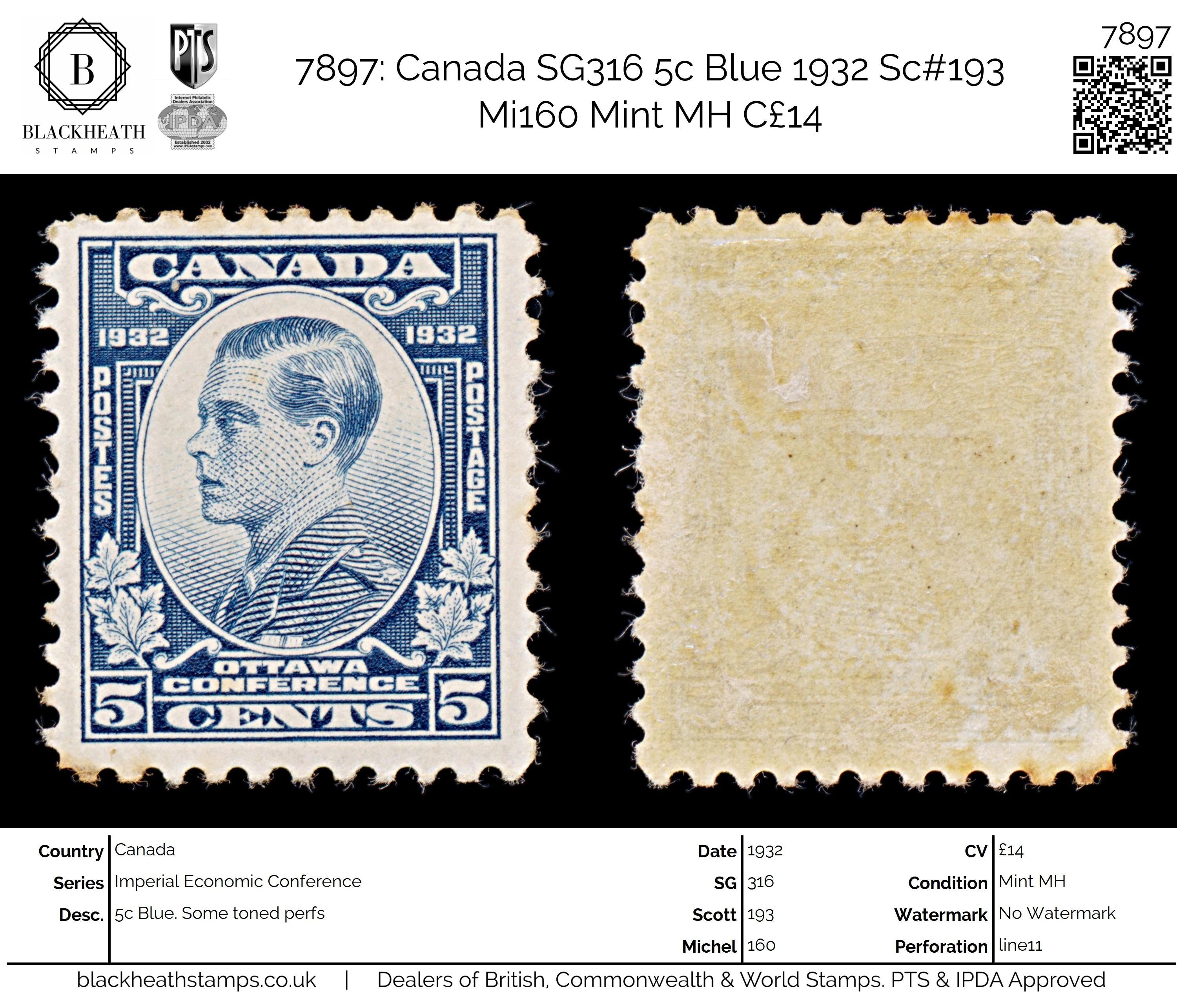 7897: Canada SG316 5c Blue 1932 Sc#193 Mi160 Mint MH C£14