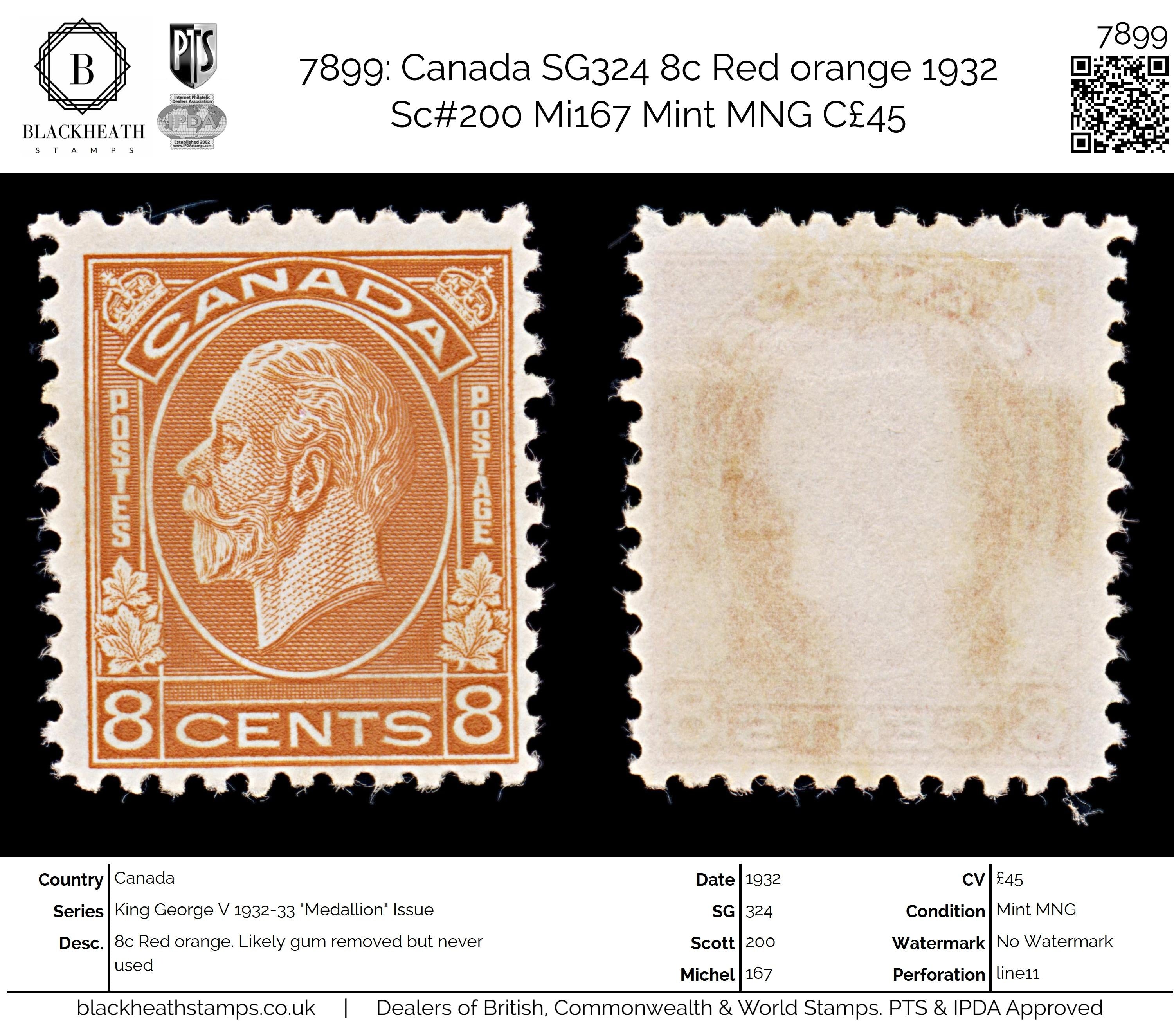 7899: Canada SG324 8c Red orange 1932 Sc#200 Mi167 Mint MNG C£45: Likely gum removed but never uséd