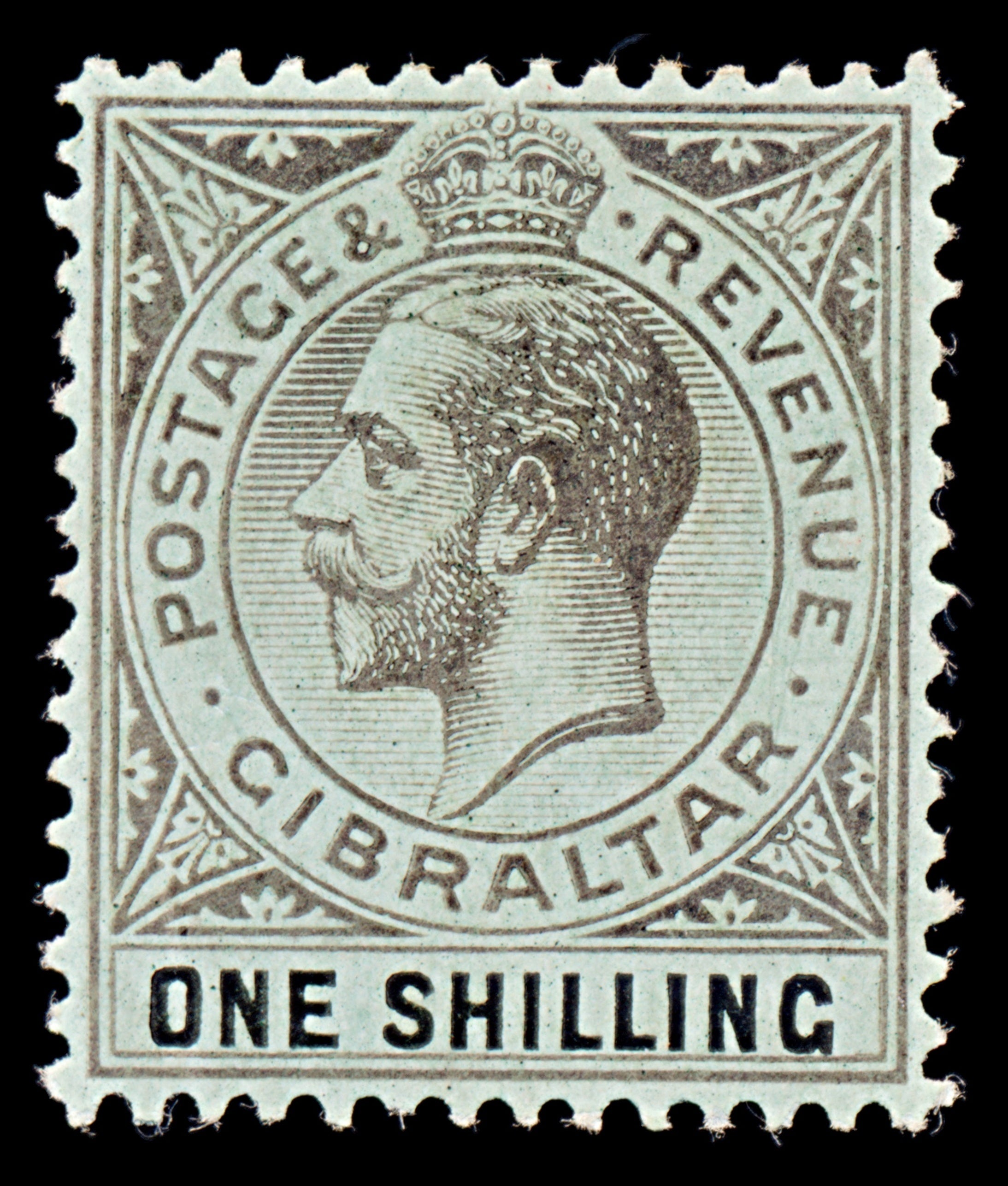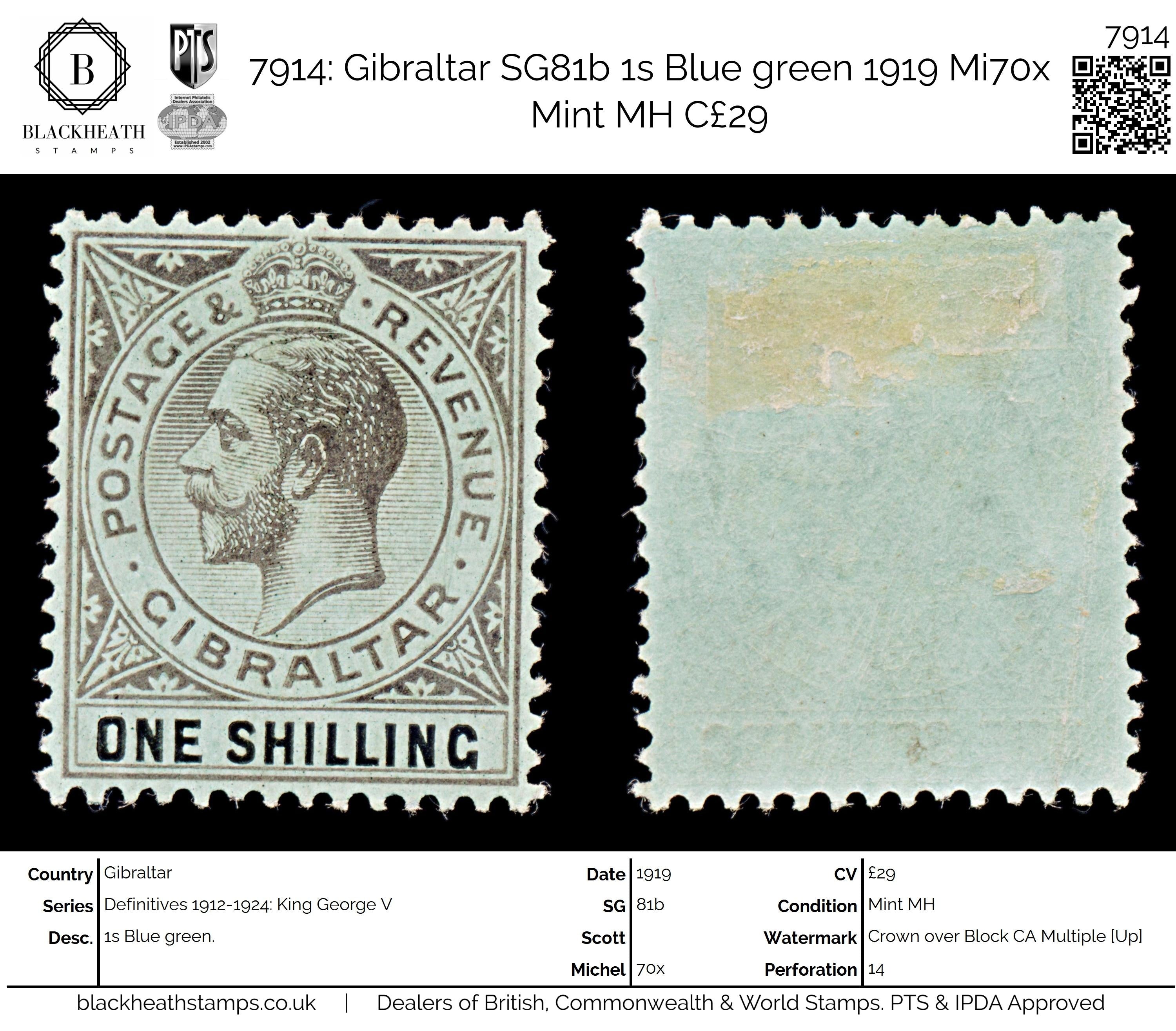 7914: Gibraltar SG81b 1s Blue green 1919 Mi70x Mint MH C£29