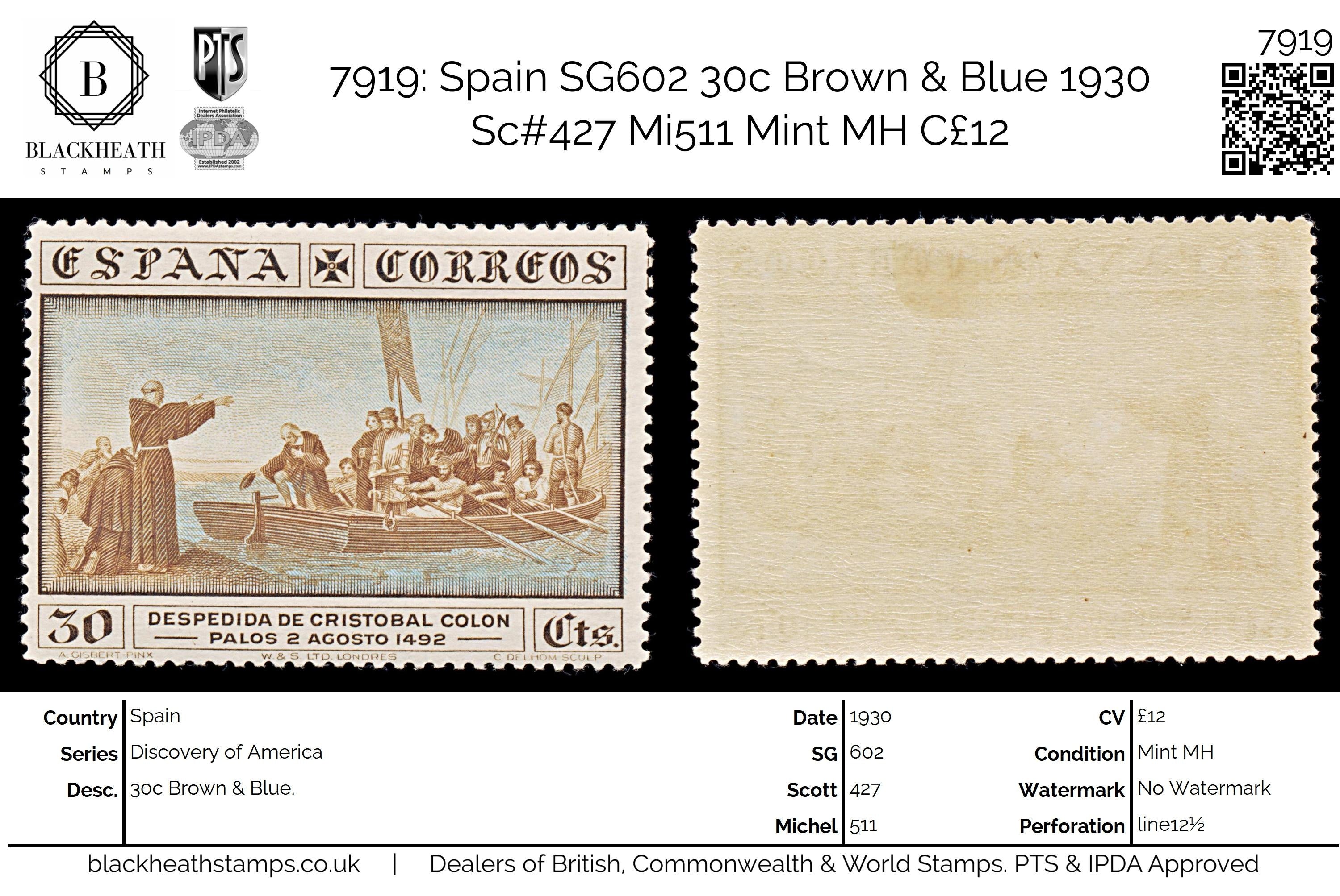 7919: Spain SG602 30c Brown & Blue 1930 Sc#427 Mi511 Mint MH C£12