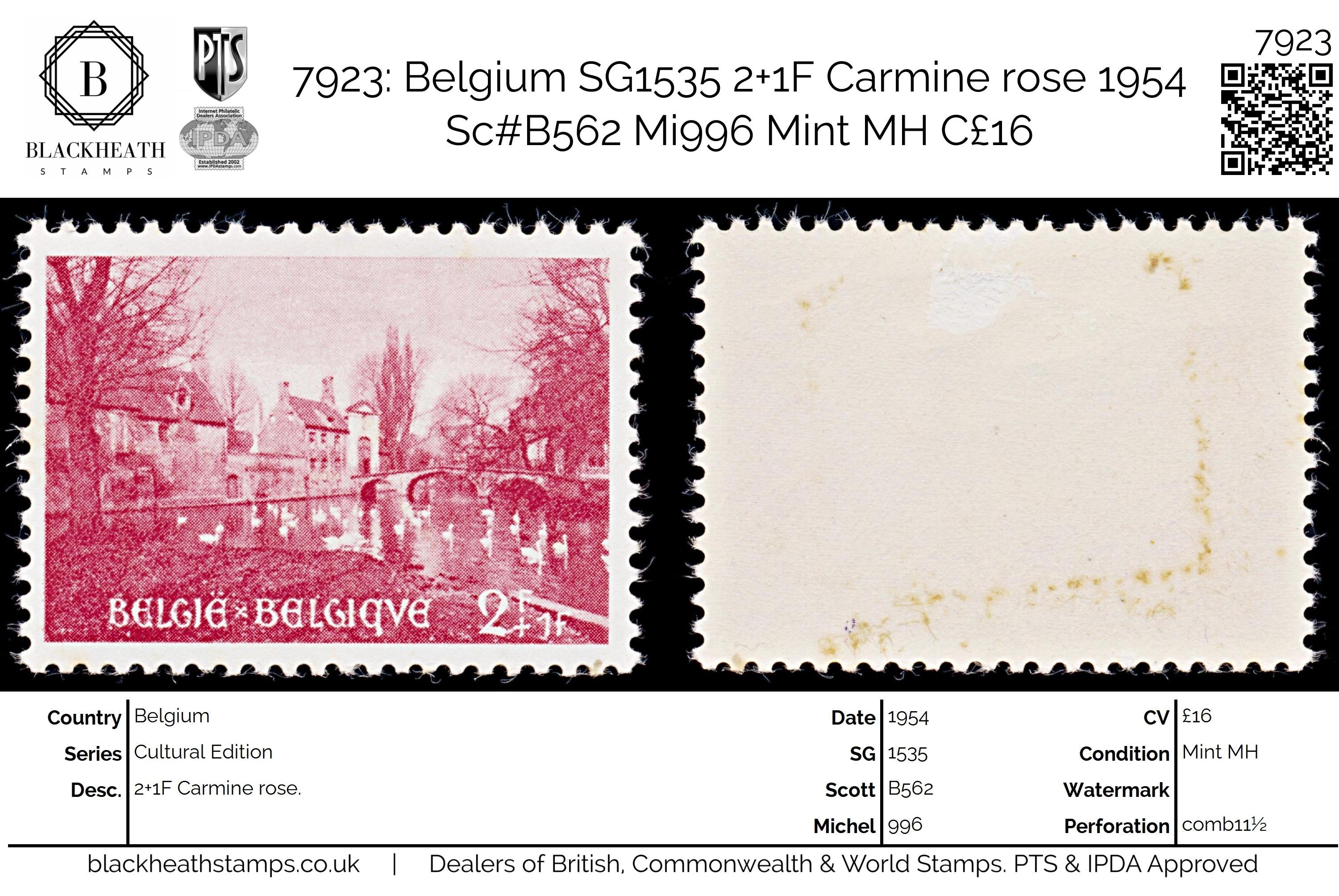 7923: Belgium SG1535 2+1F Carmine rose 1954 Sc#B562 Mi996 Mint MH C£16