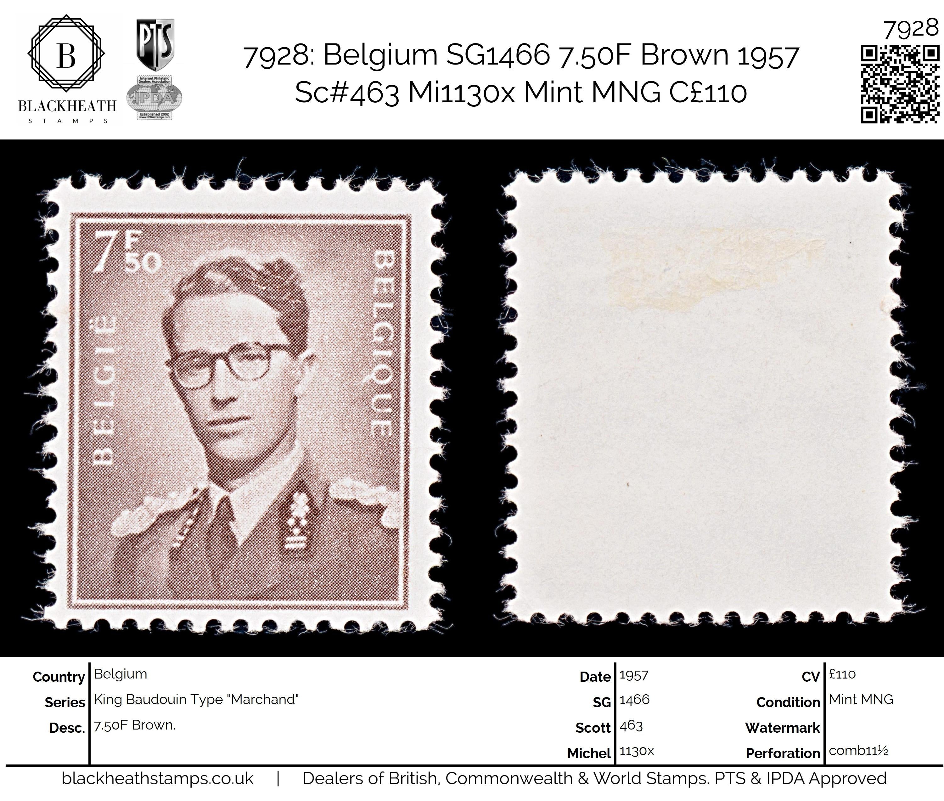 7928: Belgium SG1466 7.50F Brown 1957 Sc#463 Mi1130x Mint MNG C£110