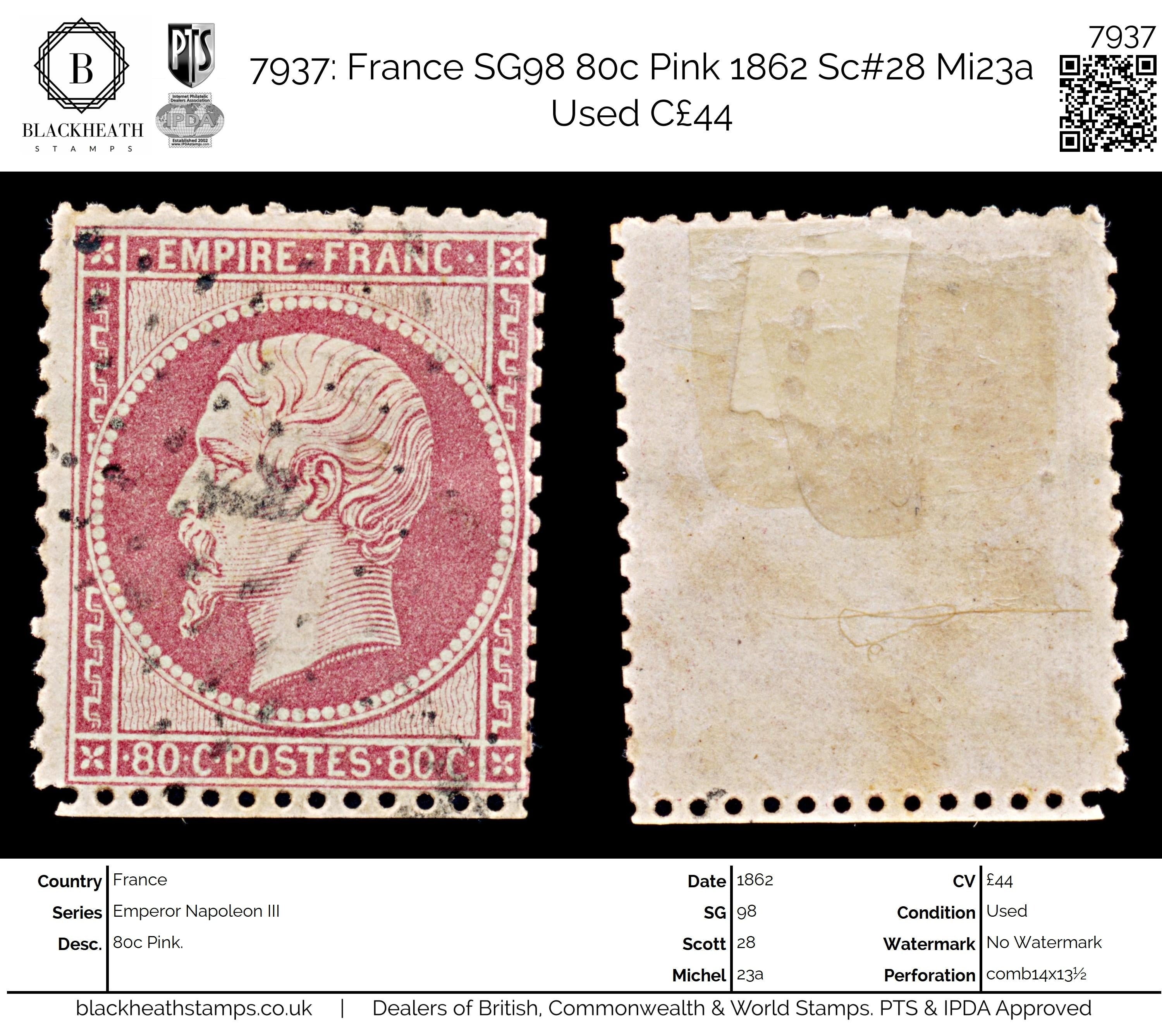 7937: France SG98 80c Pink 1862 Sc#28 Mi23a Used C£44