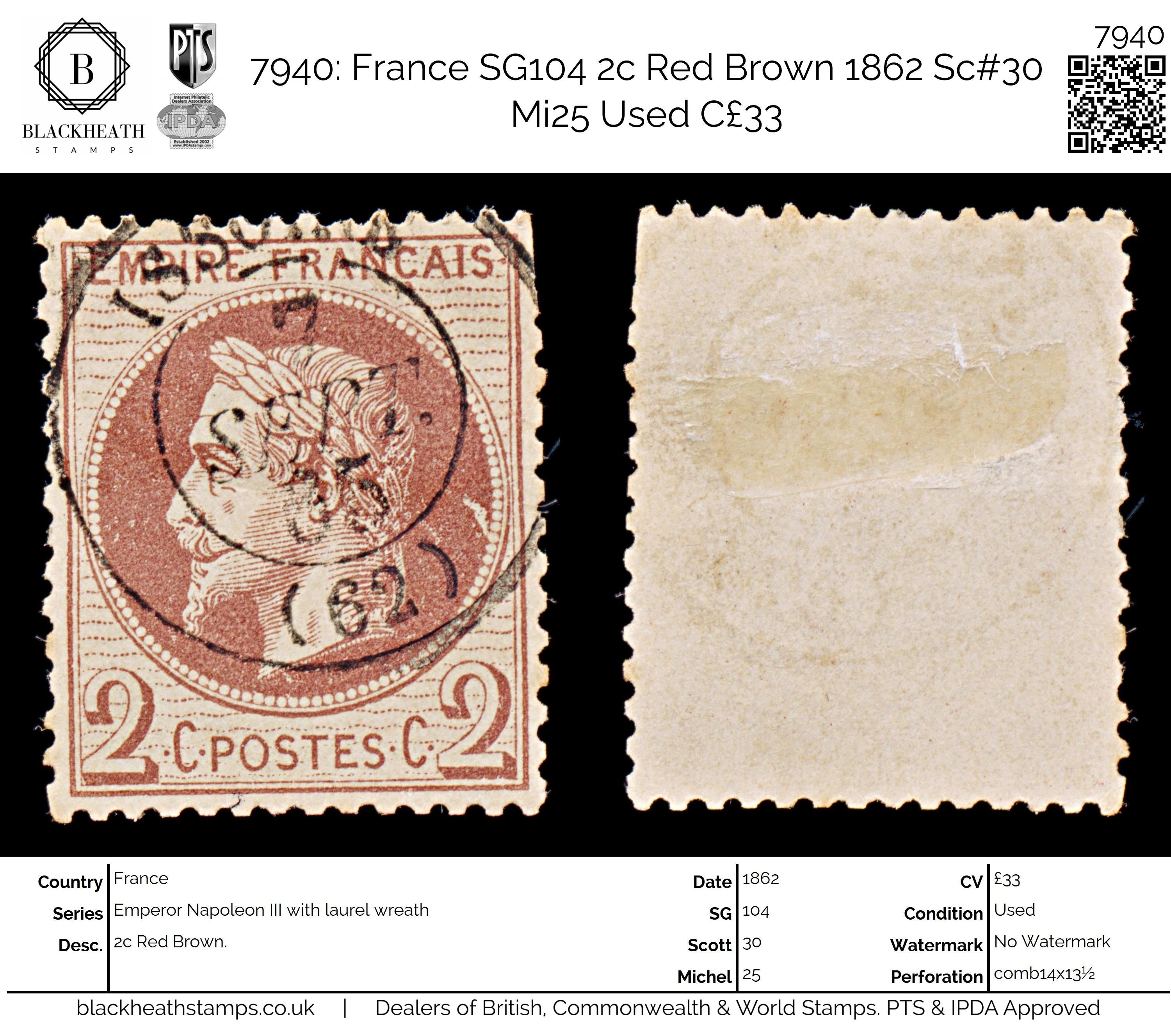 7940: France SG104 2c Red Brown 1862 Sc#30 Mi25 Uséd C£33