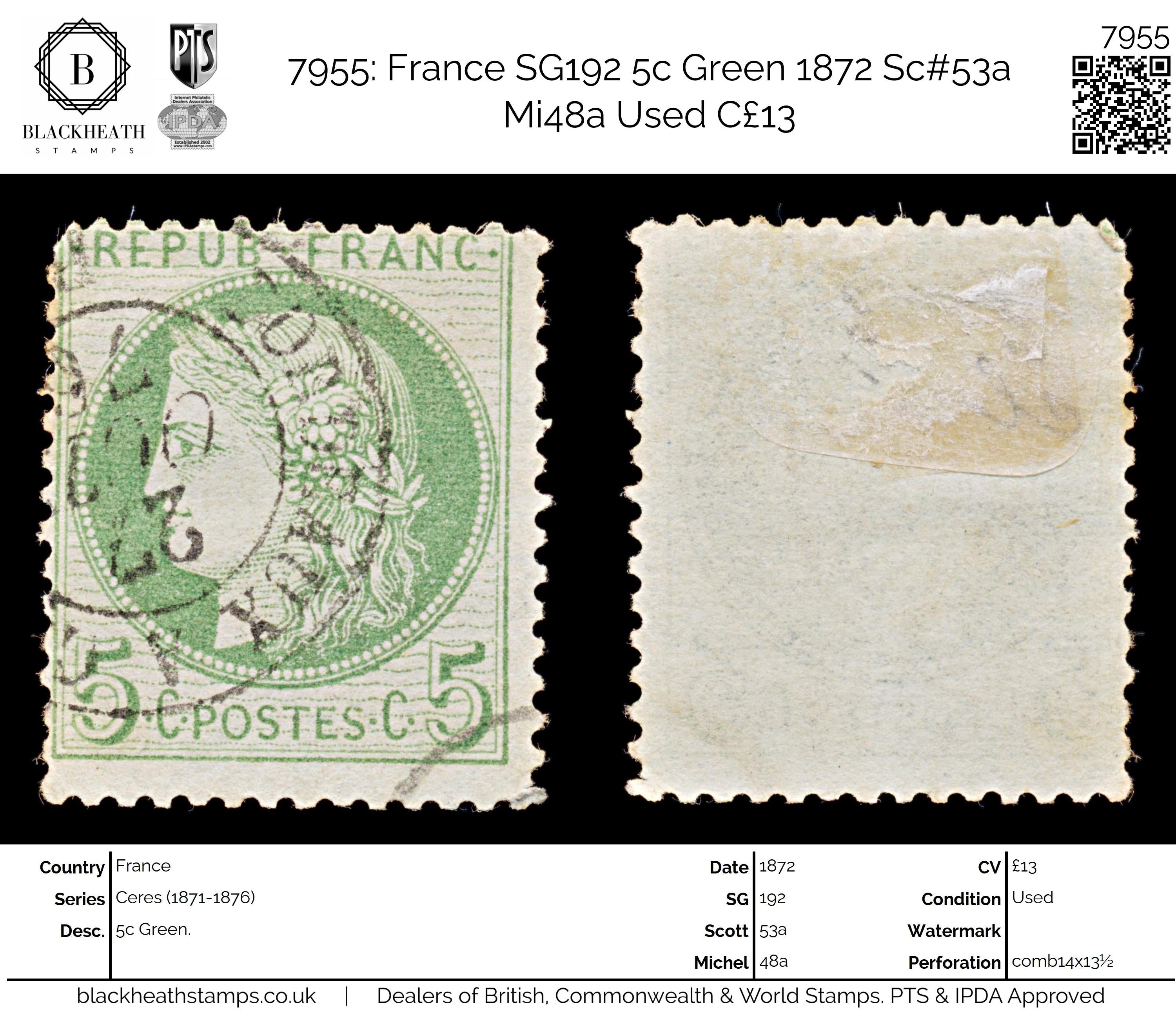 7955: France SG192 5c Green 1872 Sc#53a Mi48a Uséd C£13