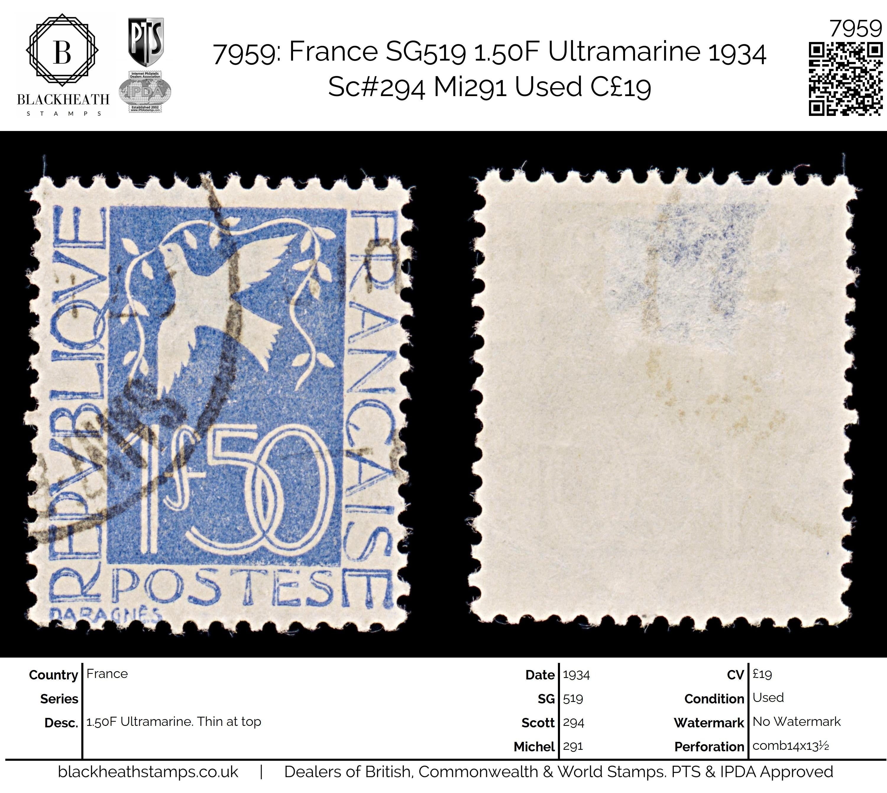 7959: France SG519 1.50F Ultramarine 1934 Sc#294 Mi291 Used C£19