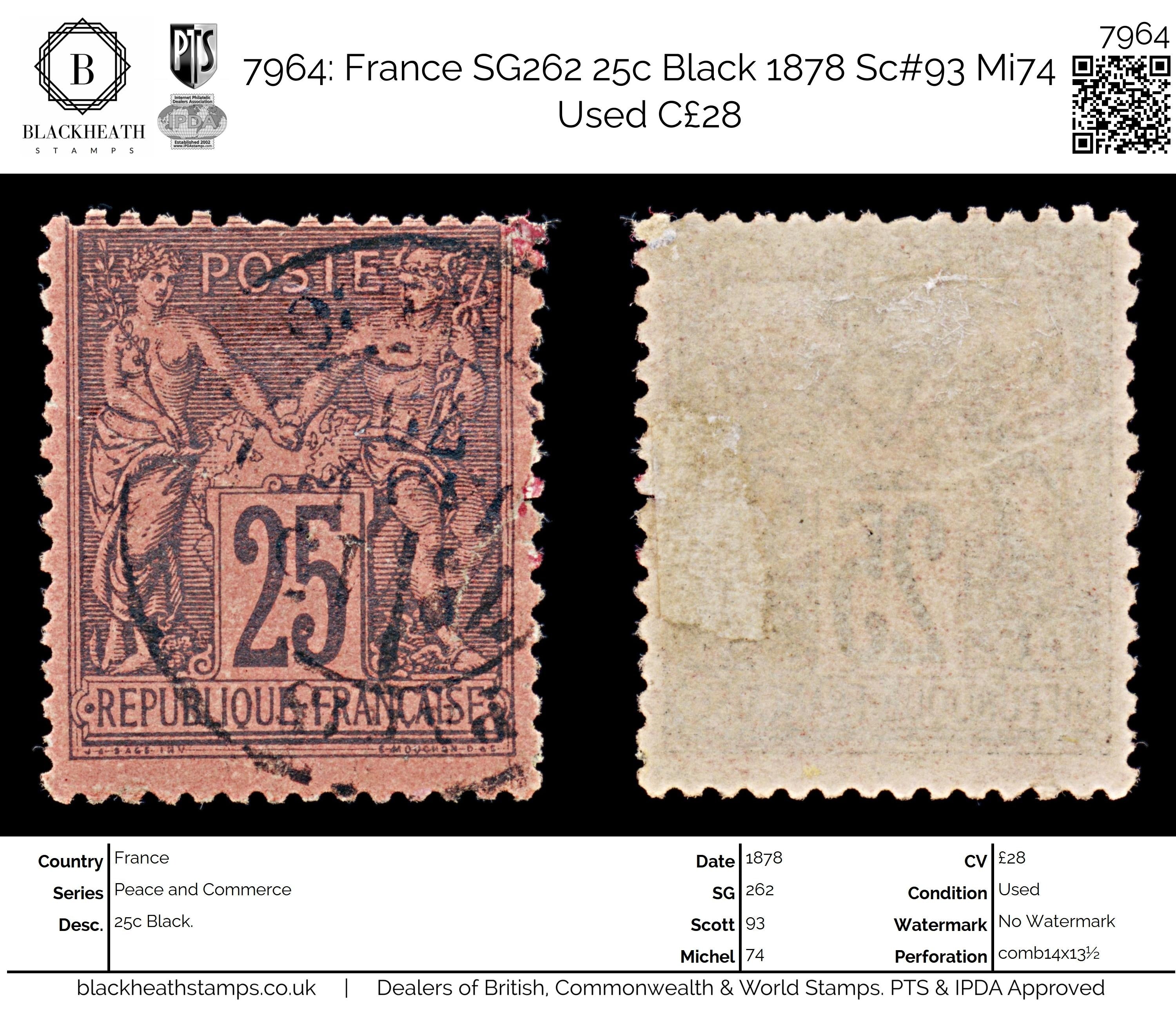 7964: France SG262 25c Black 1878 Sc#93 Mi74 Used C£28