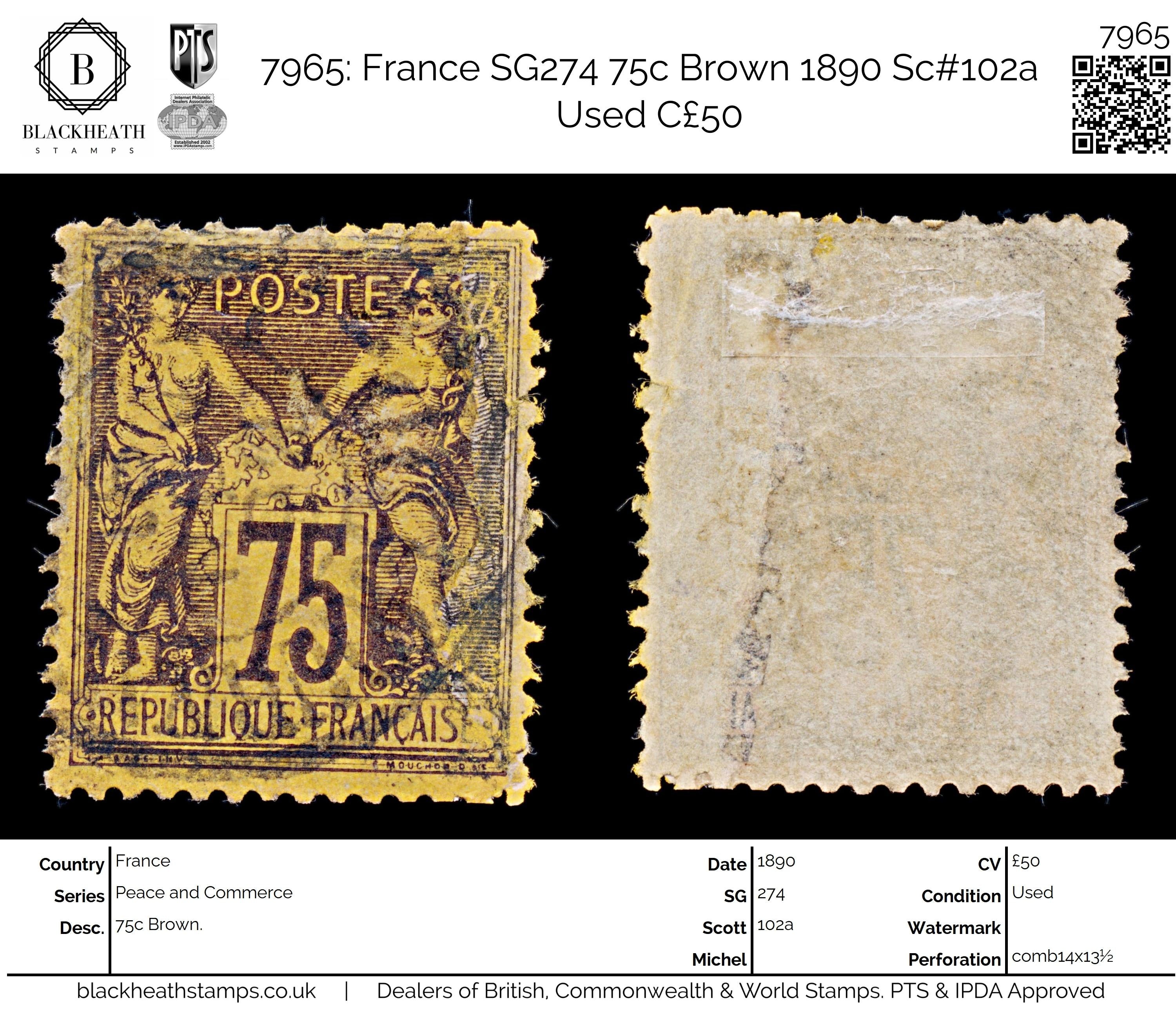 7965: France SG274 75c Brown 1890 Sc#102a Uséd C£50