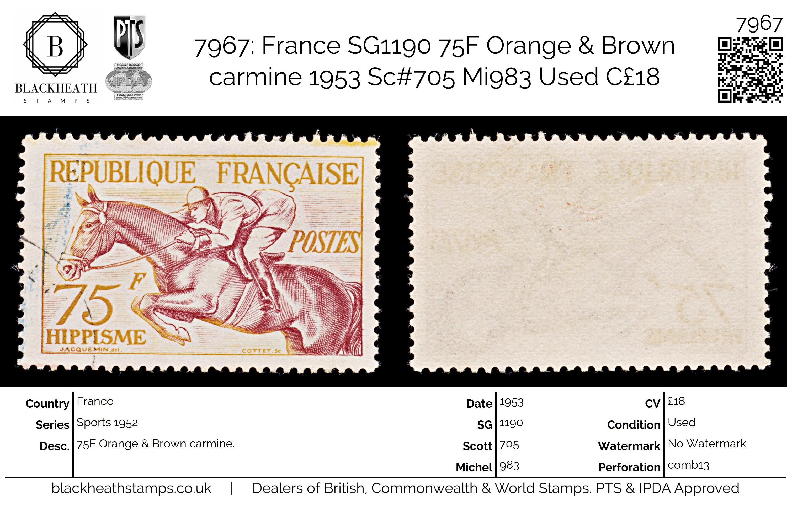 7967: France SG1190 75F Orange & Brown carmine 1953 Sc#705 Mi983 Uséd C£18