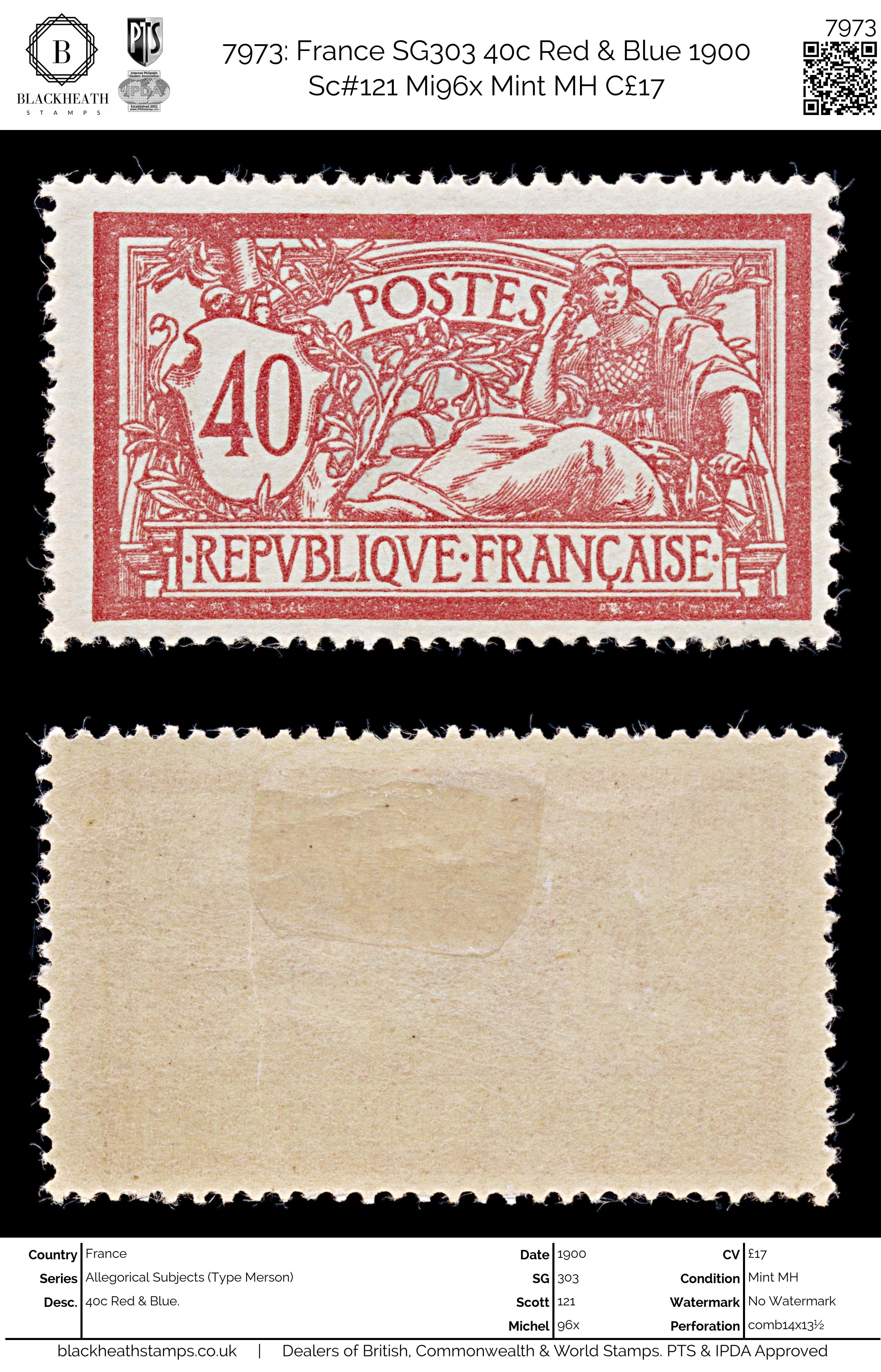 7973: France SG303 40c Red & Blue 1900 Sc#121 Mi96x Mint MH C£17