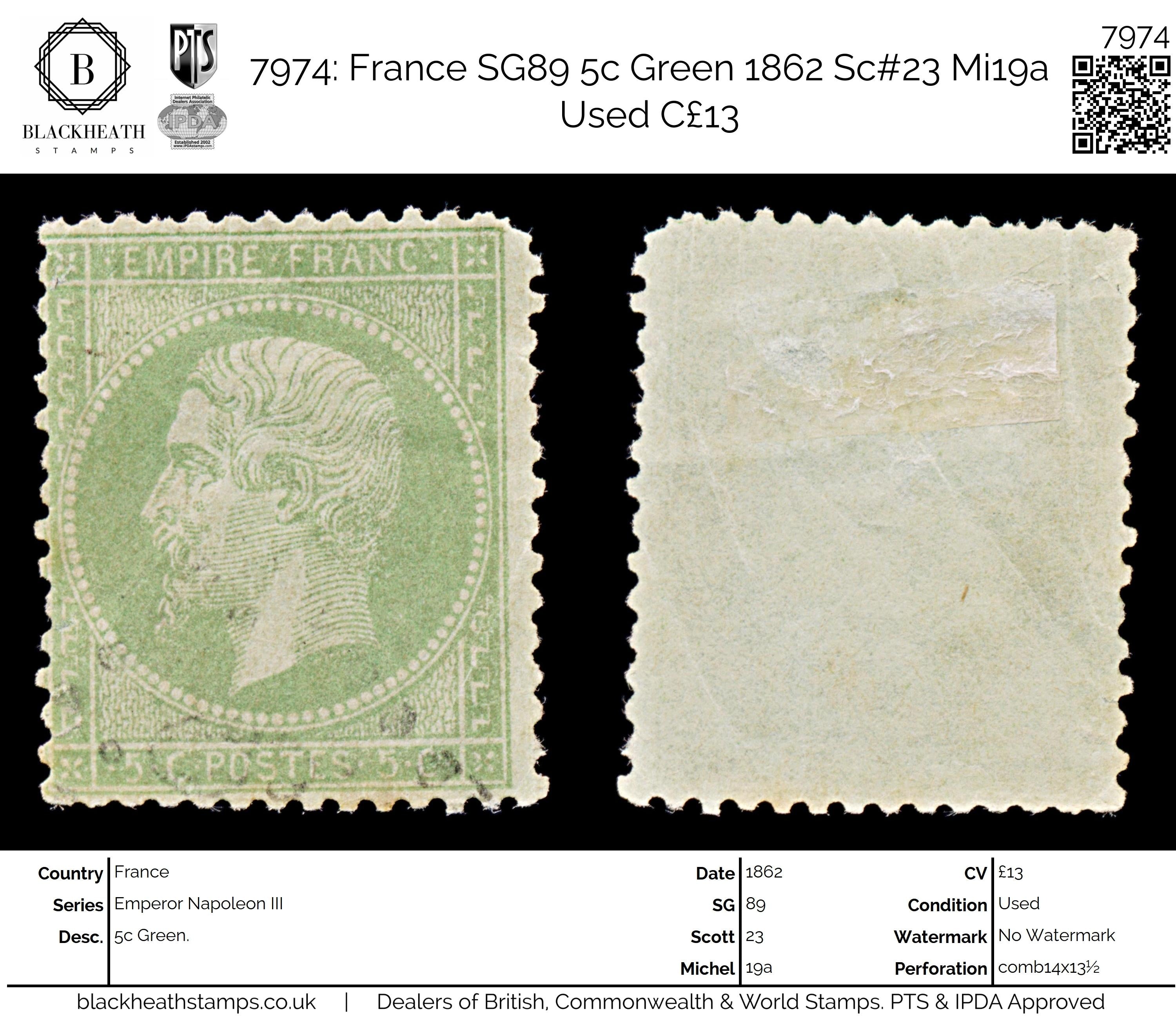 7974: France SG89 5c Green 1862 Sc#23 Mi19a Uséd C£13