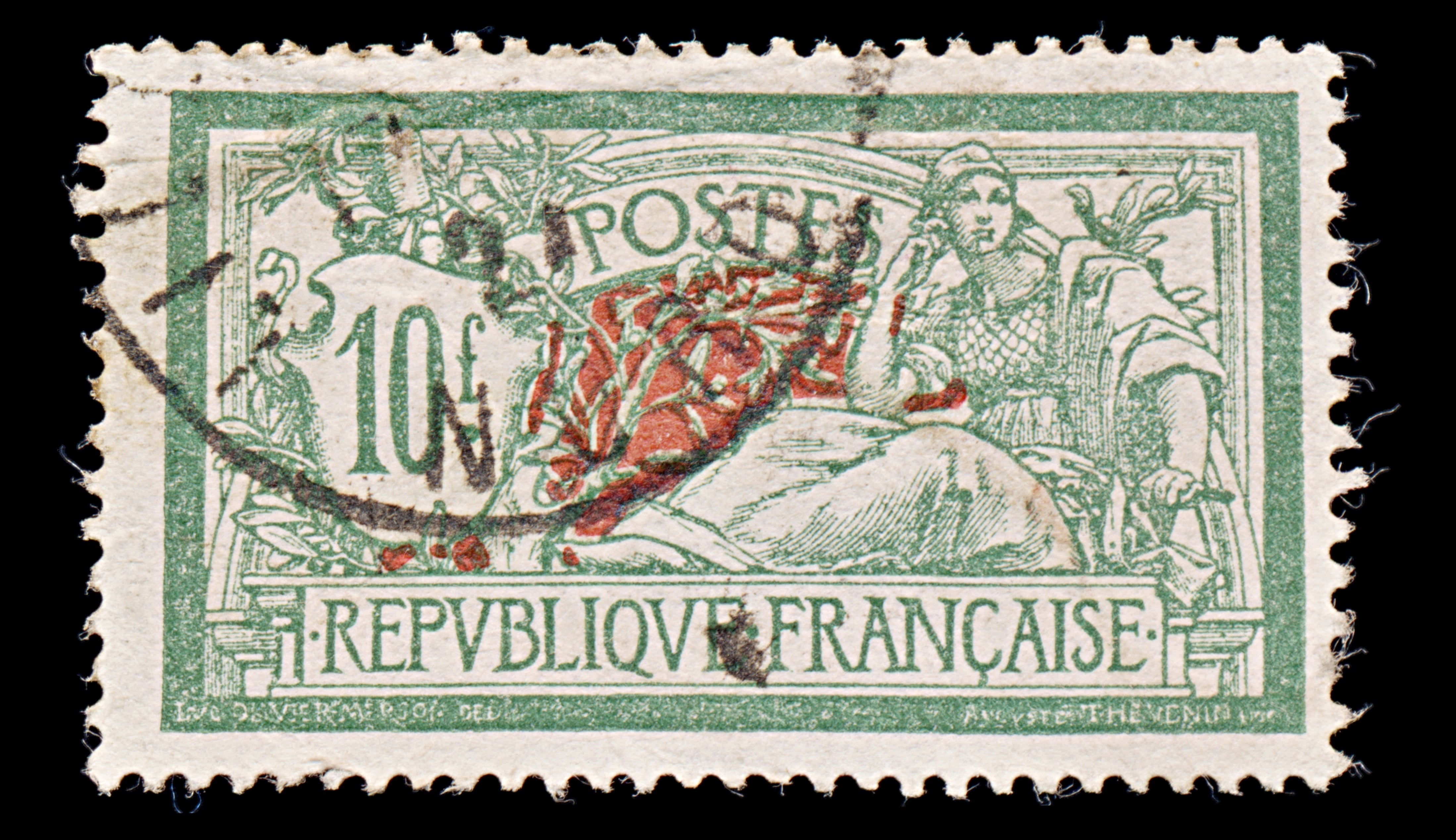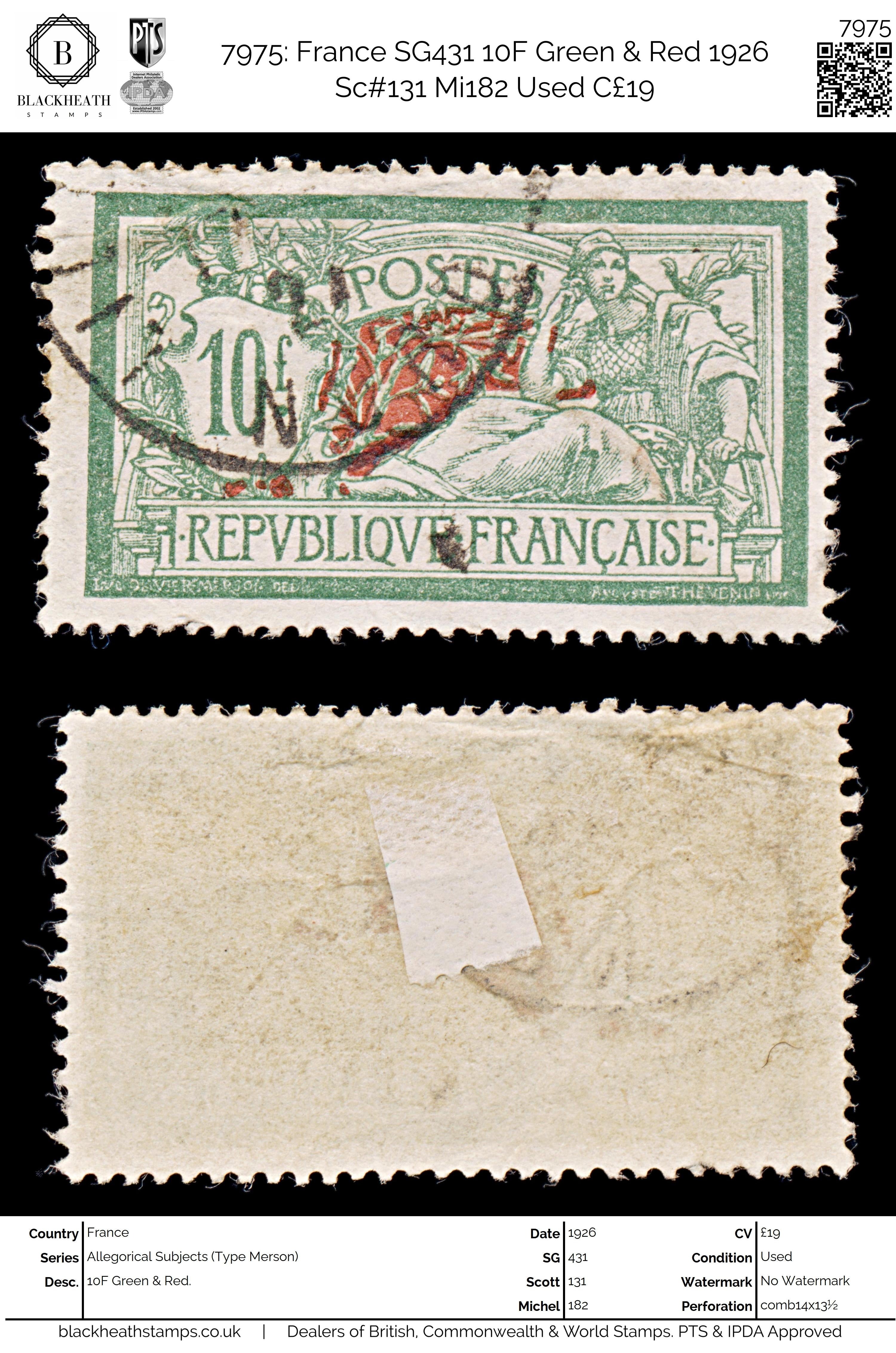 7975: France SG431 10F Green & Red 1926 Sc#131 Mi182 Uséd C£19