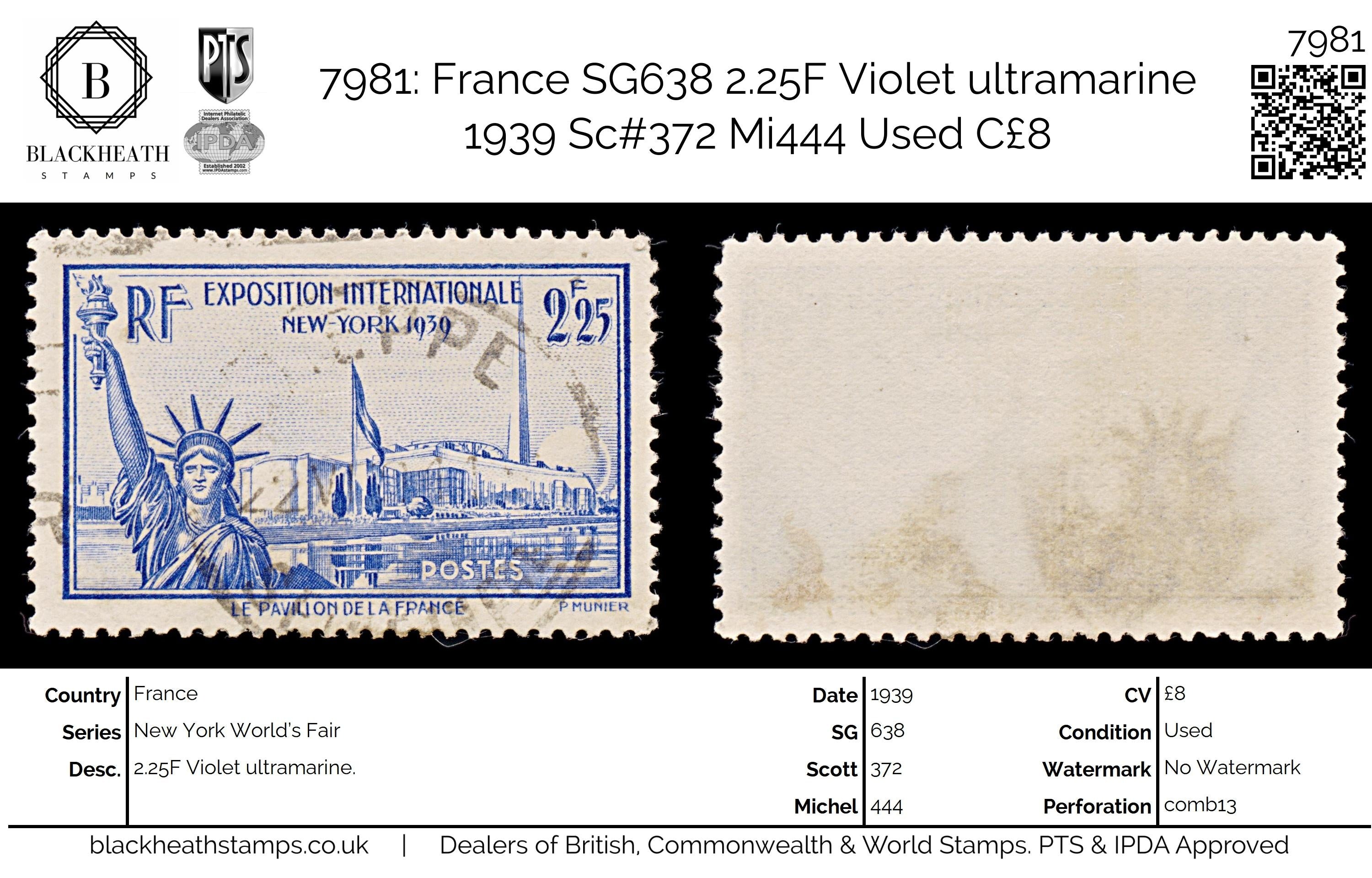 7981: France SG638 2.25F Violet ultramarine 1939 Sc#372 Mi444 Uséd C£8