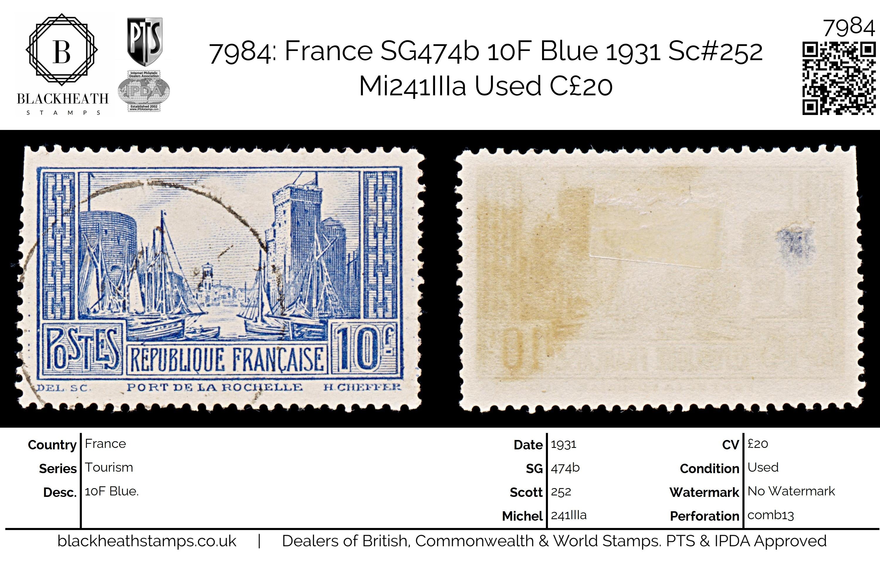 7984: France SG474b 10F Blue 1931 Sc#252 Mi241IIIa Uséd C£20