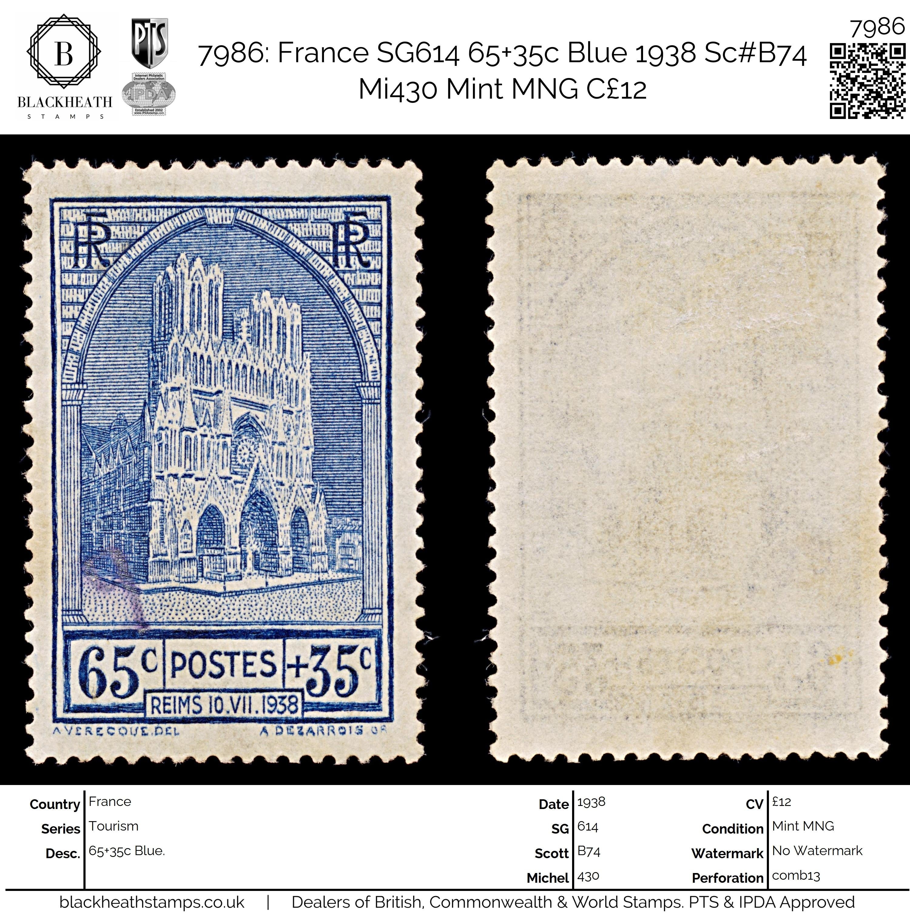 7986: France SG614 65+35c Blue 1938 Sc#B74 Mi430 Mint MNG C£12
