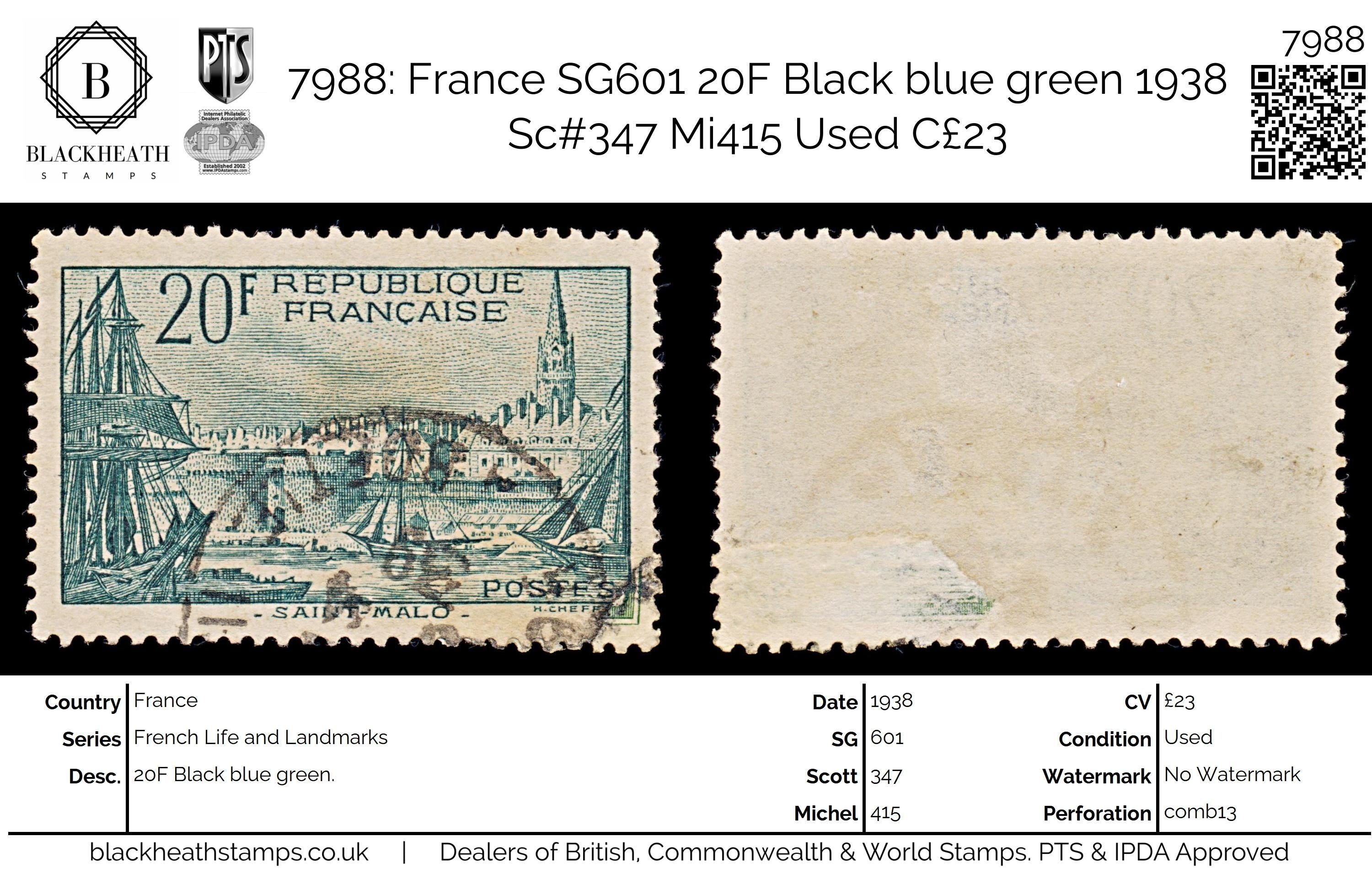 7988: France SG601 20F Black blue green 1938 Sc#347 Mi415 Uséd C£23