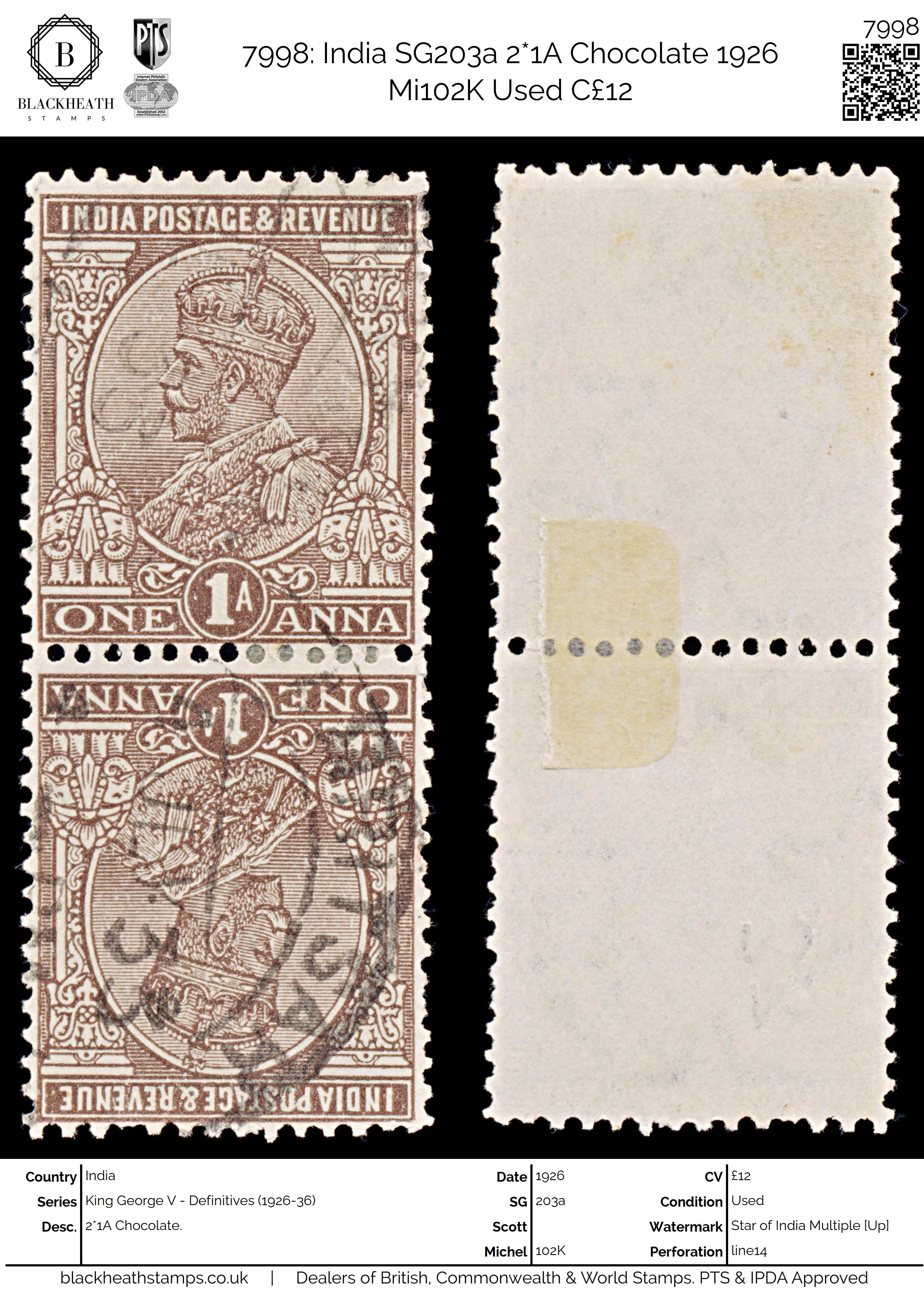 7998: India SG203a 2*1A Chocolate 1926 Mi102K Uséd C£12