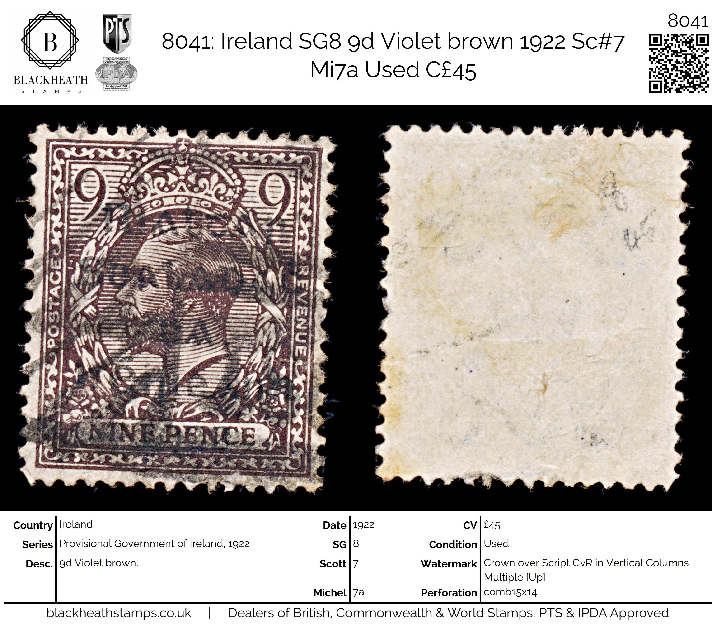 8041: Ireland SG8 9d Violet brown 1922 Sc#7 Mi7a Used C£45