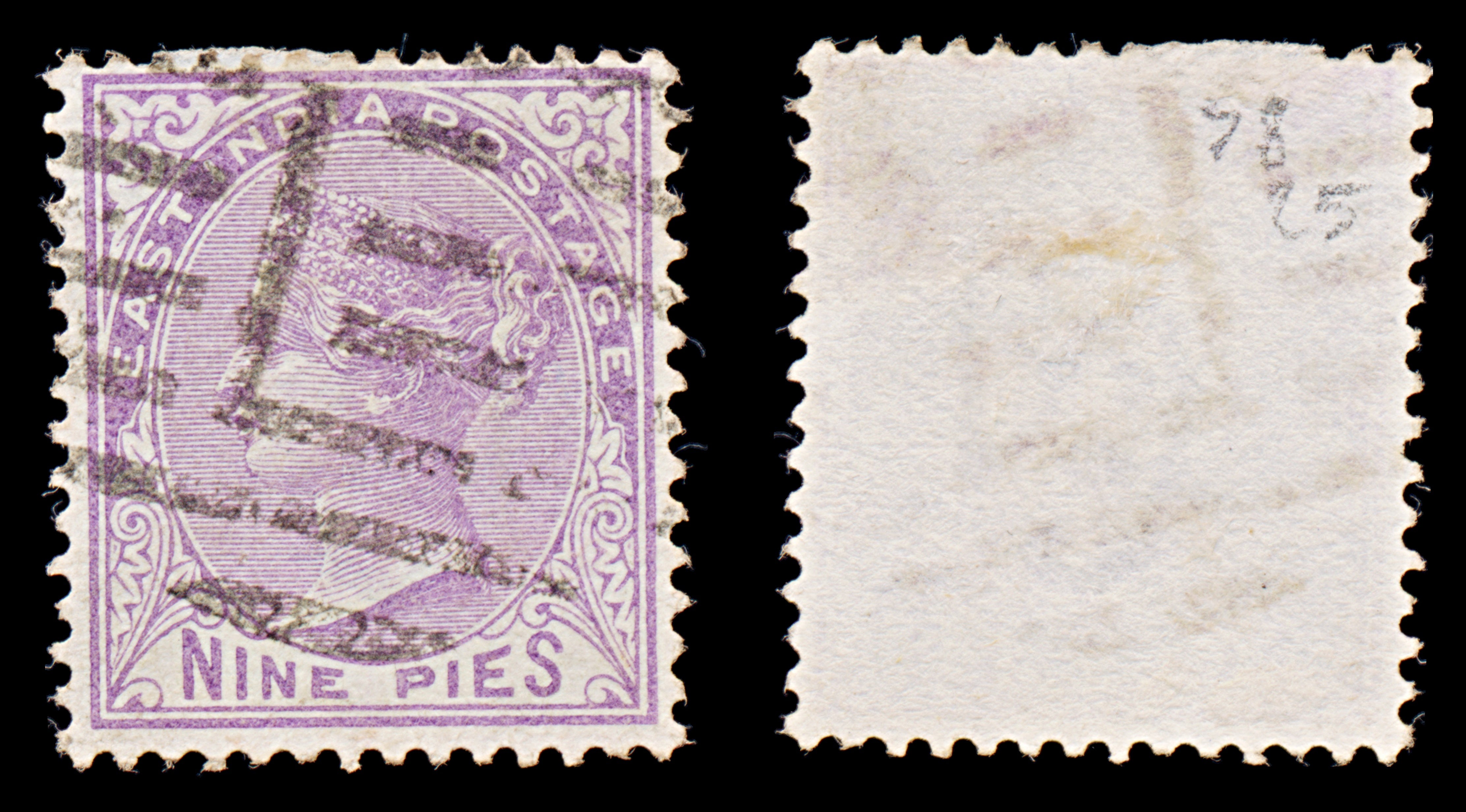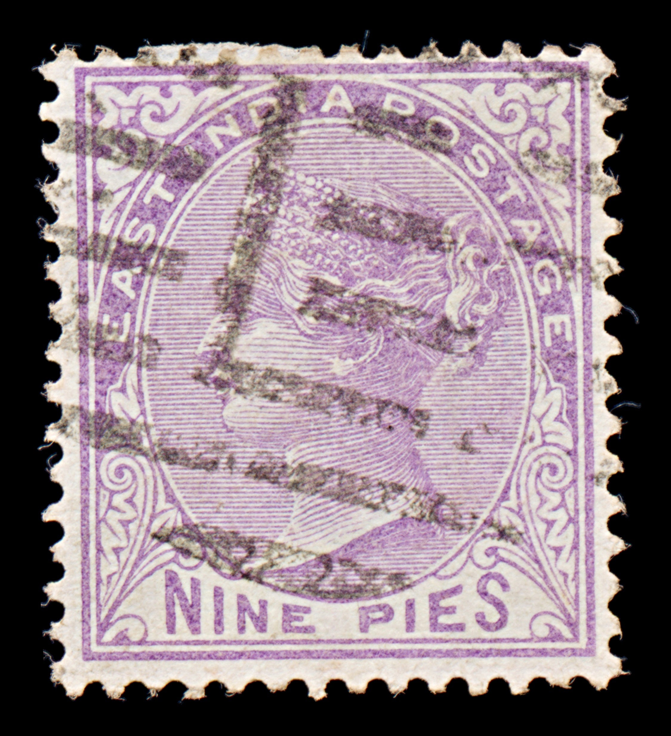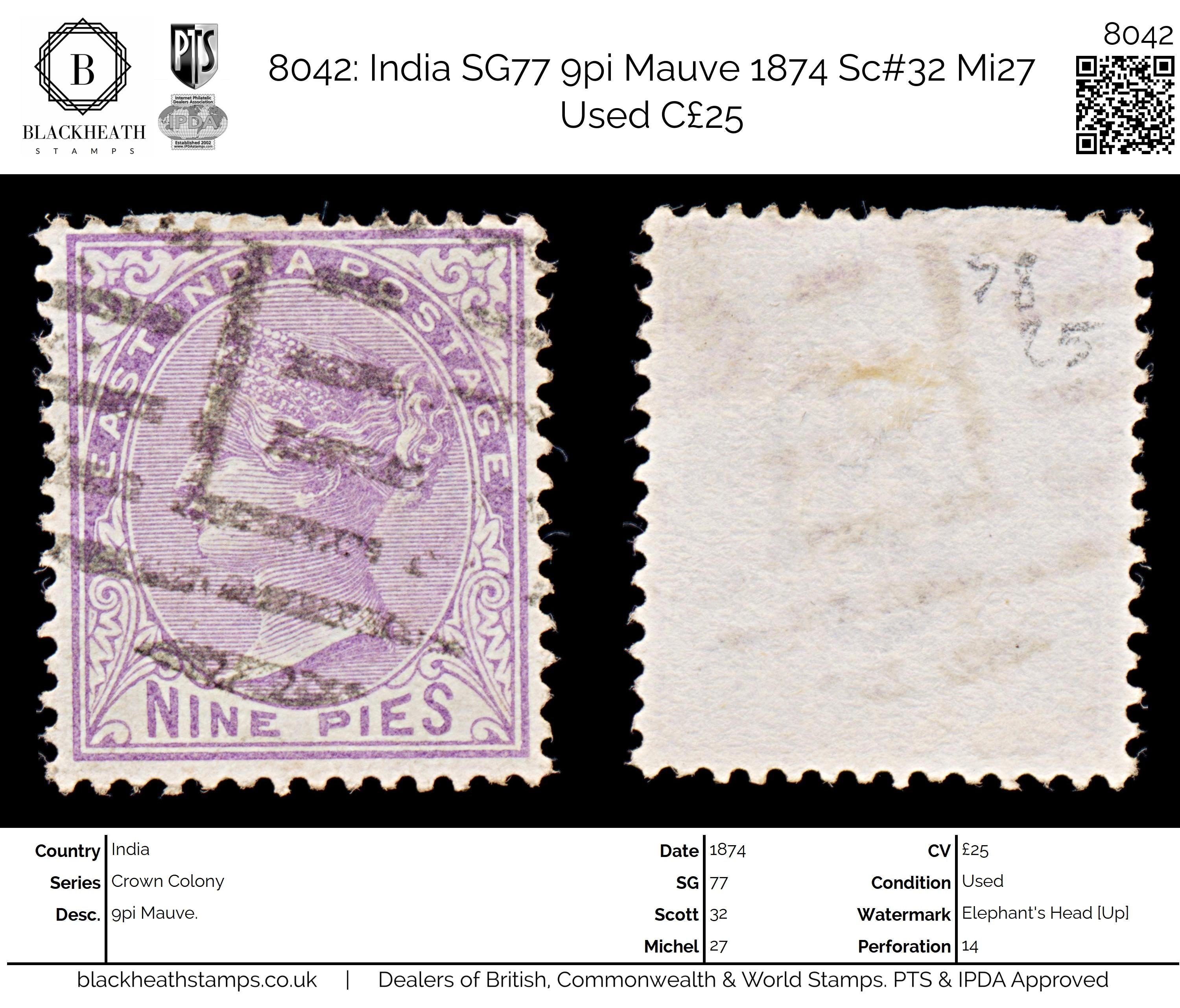 8042: India SG77 9pi Mauve 1874 Sc#32 Mi27 Uséd C£25