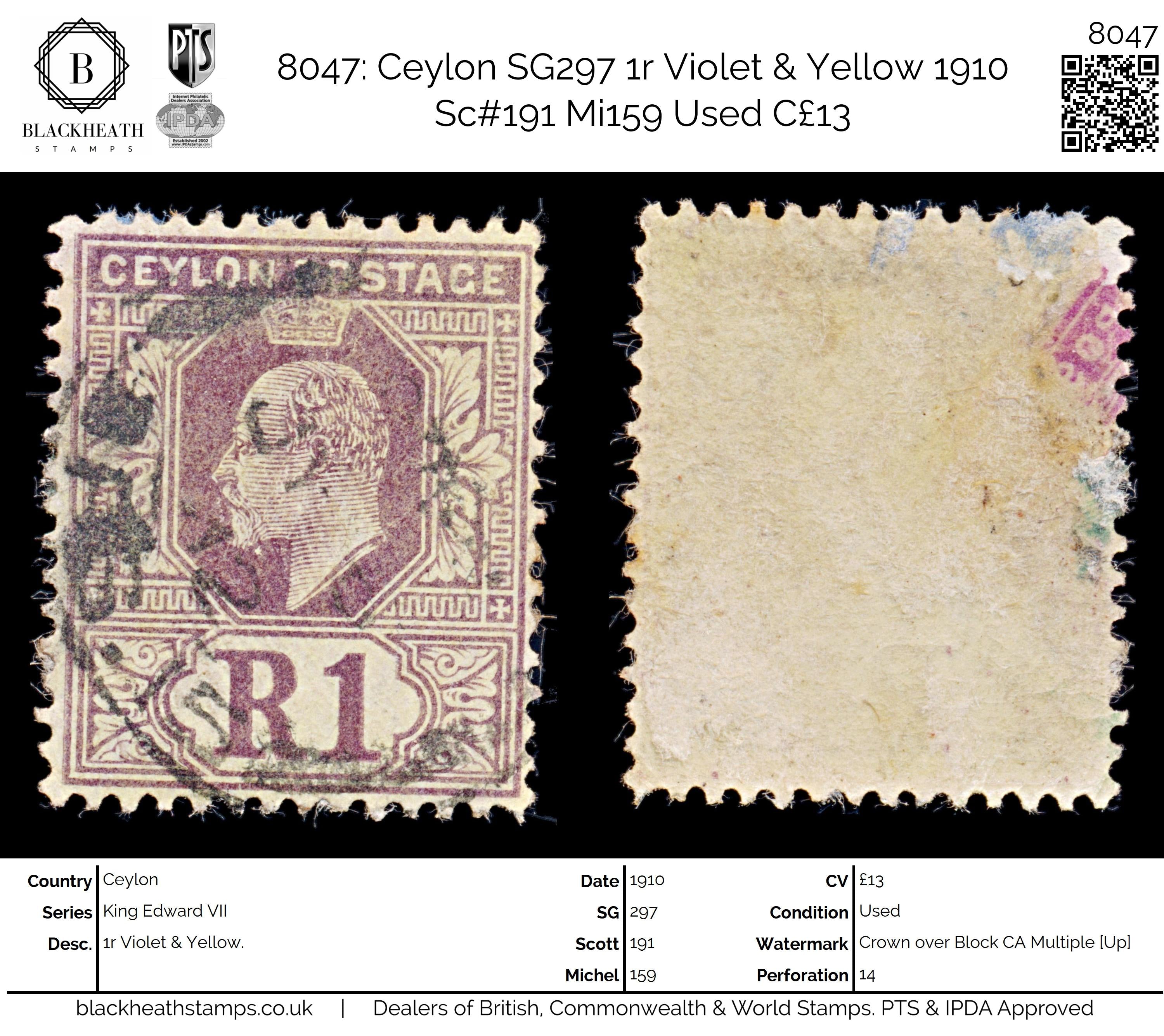 8047: Ceylon SG297 1r Violet & Yellow 1910 Sc#191 Mi159 Uséd C£13