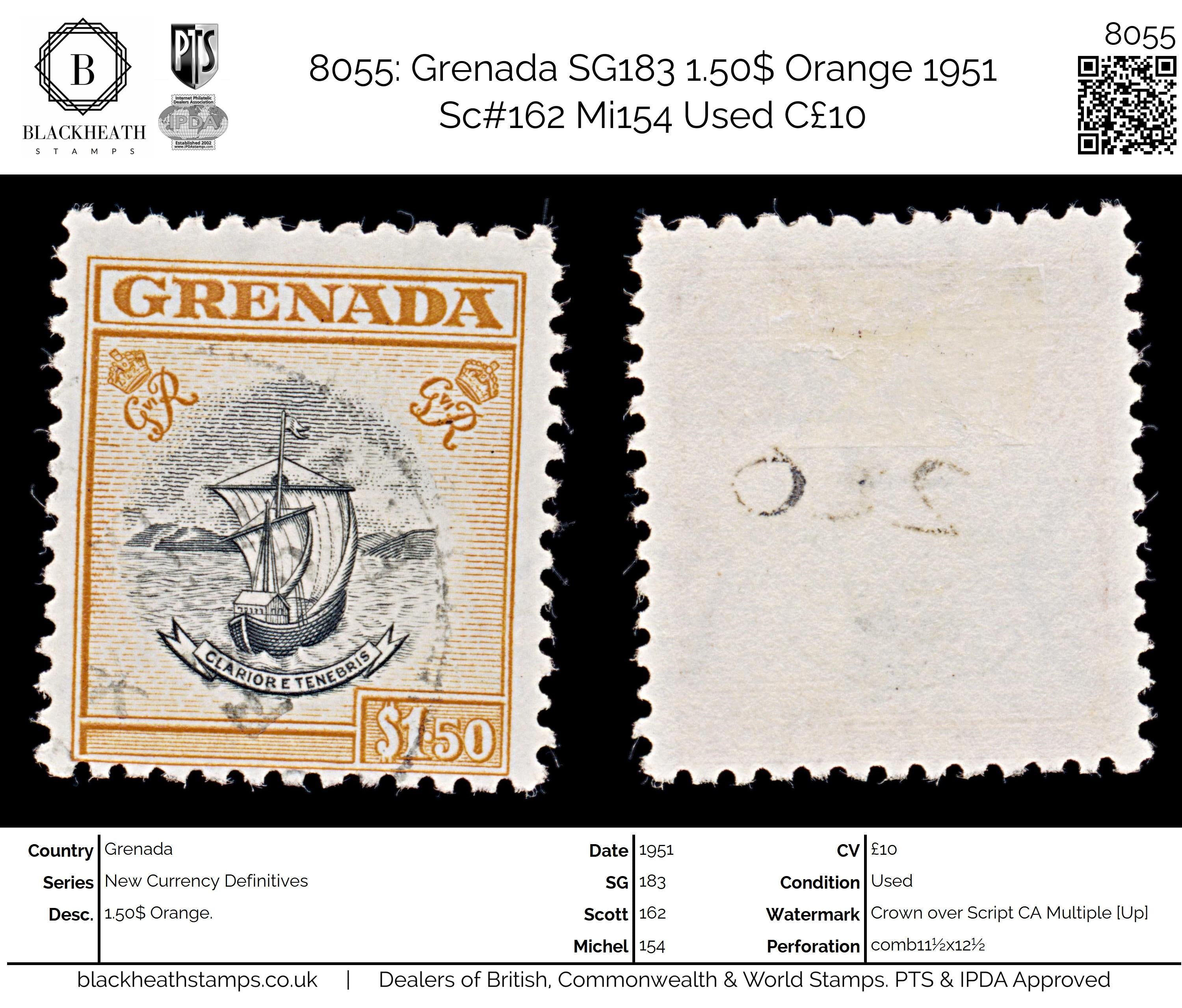 8055: Grenada SG183 1.50$ Orange 1951 Sc#162 Mi154 Used C£10