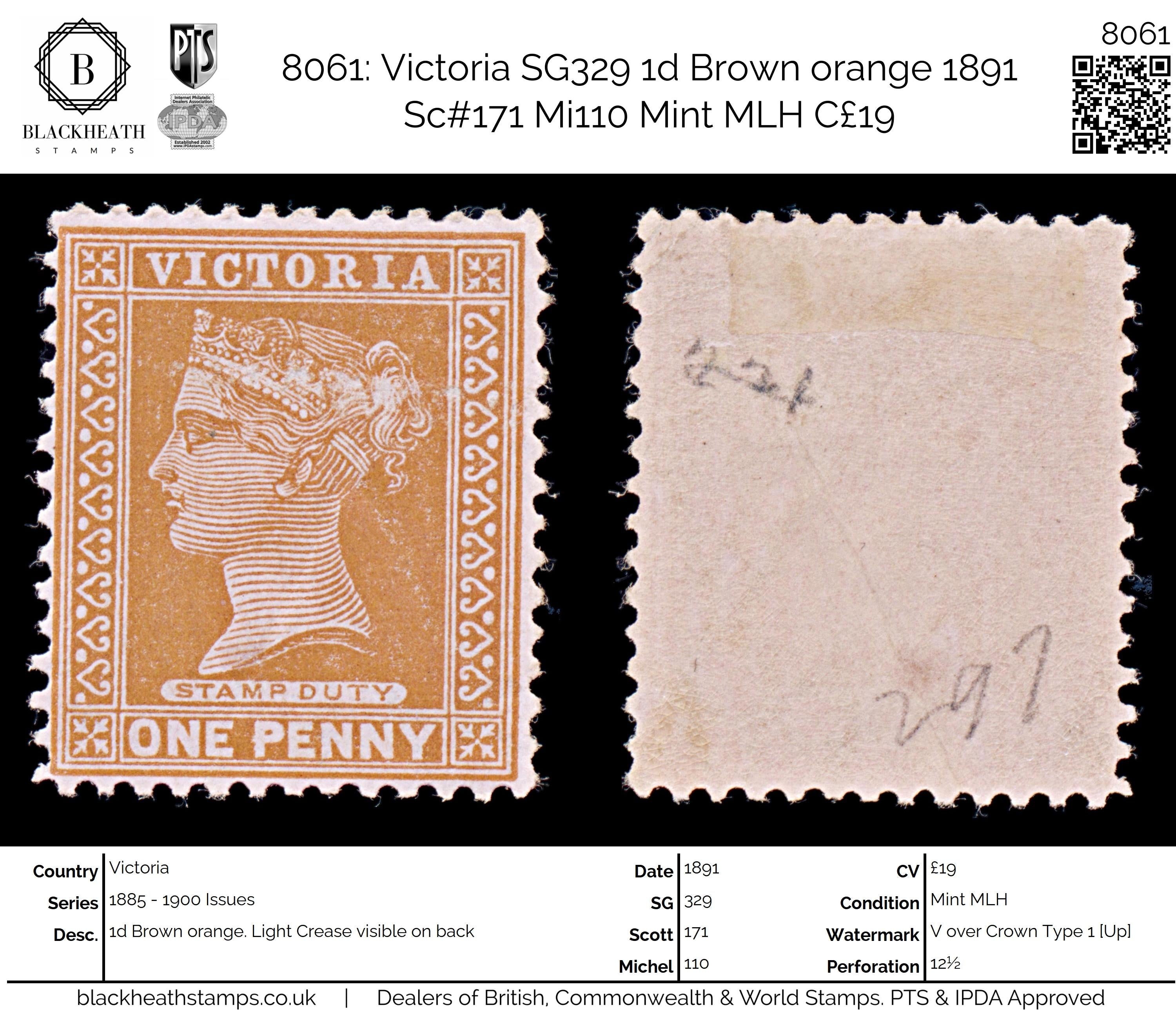 8061: Victoria SG329 1d Brown orange 1891 Sc#171 Mi110 Mint MLH C£19: Light Crease visible on back