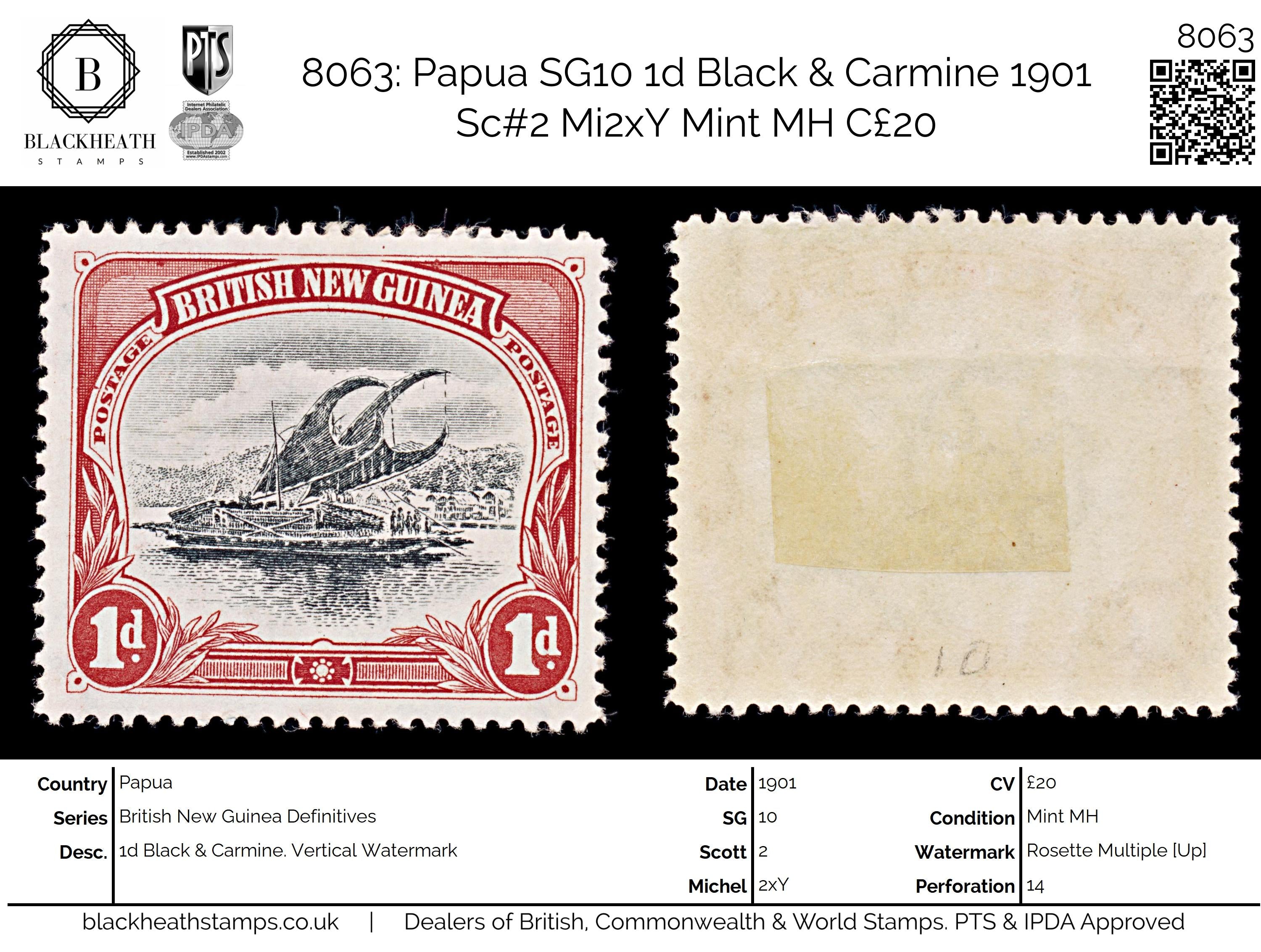 8063: Papua SG10 1d Black & Carmine 1901 Sc#2 Mi2xY Mint MH C£20: Vertical Watermark