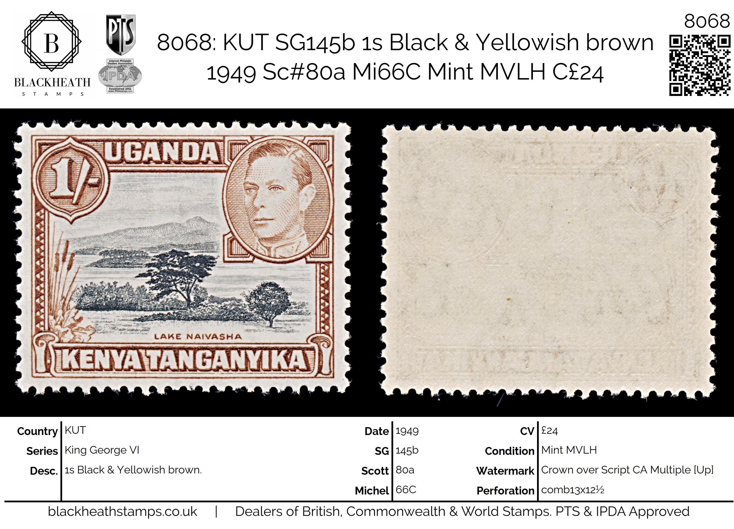 8068: KUT SG145b 1s Black & Yellowish brown 1949 Sc#80a Mi66C Mint MVLH C£24