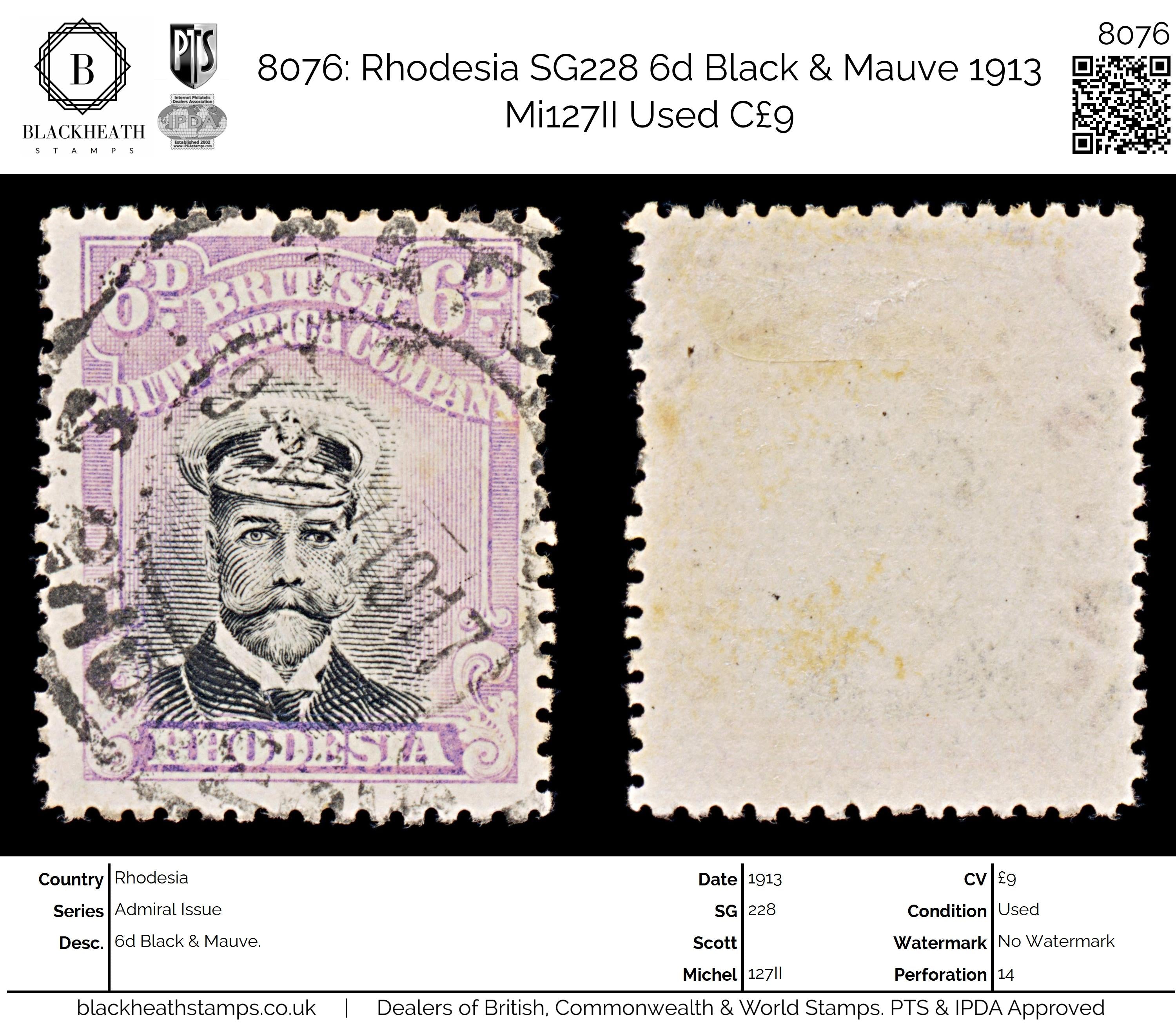 8076: Rhodesia SG228 6d Black & Mauve 1913 Mi127II Uséd C£9